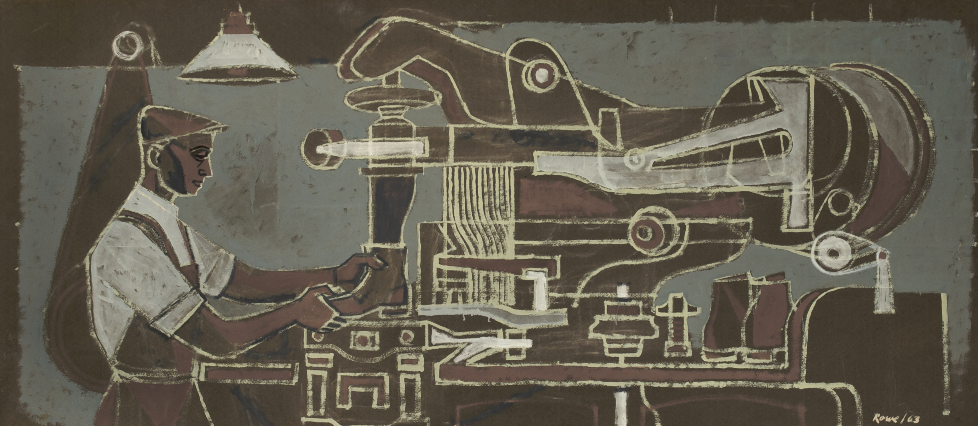 A man wearing a red hat, white t-shirt and red apron makes a shoe on the long boot machine. The long boot machine is painted in dark brown and red, and is outlined in white lines. Thier is a white light above his head. The colours of background is greyish-blue and black.