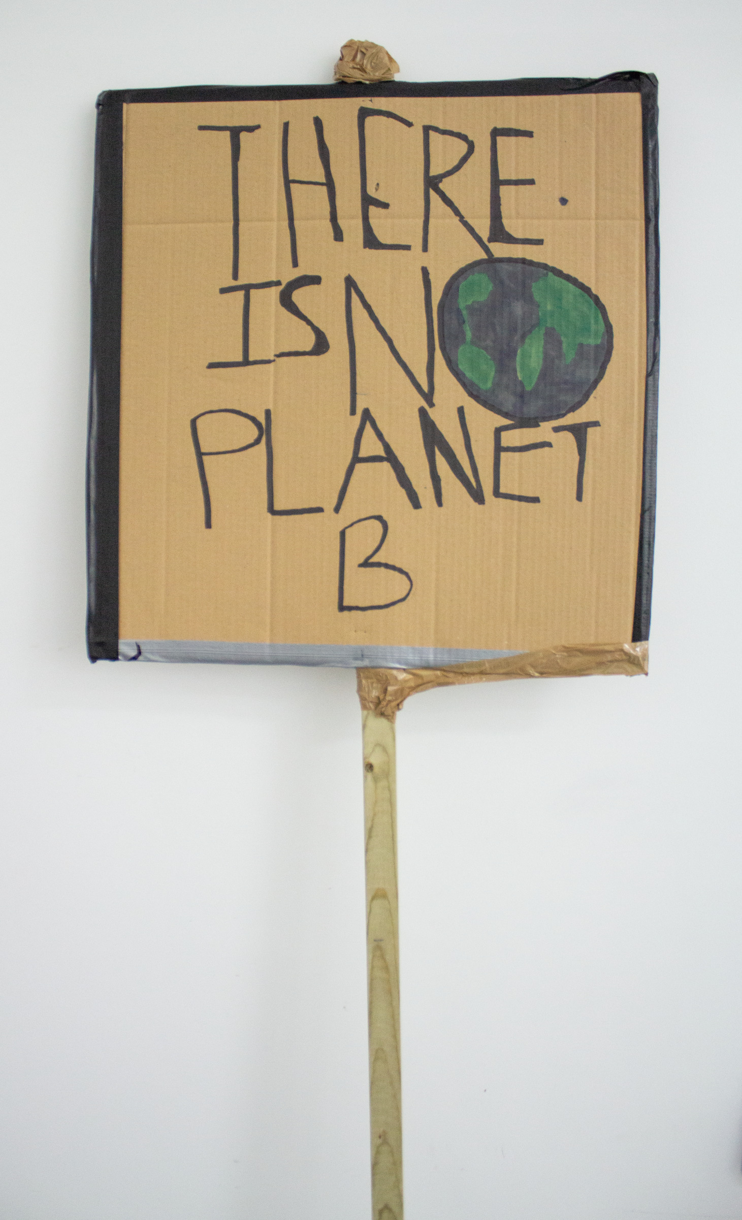 Large placard readinng 'There is no planet B' with a picture of the Earth representing the 'o'. The reverse reads 'If you don't act like adults we will'. The placard is very large and is mounted on a long piece of timber.