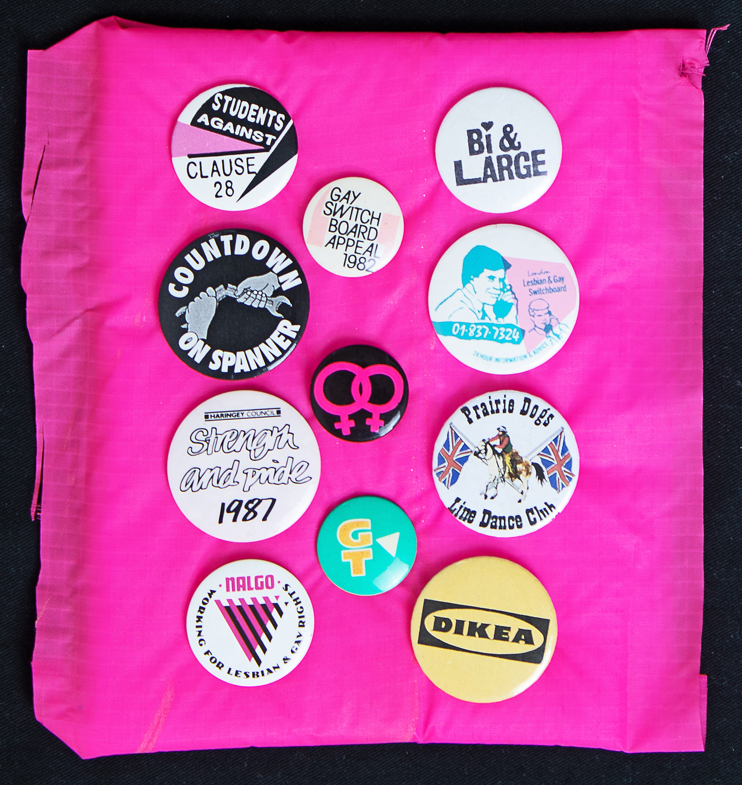 LGBTQIA+ badges mounted and framed. 11 badges of small and medium size, mounted on pink cloth and framed in a home - made cardboard square. All are related to LGBTQIA+ topics and events like protesting Clause 28 and Operation Spanner, and in support of London Lesbian & Gay Switchboard.