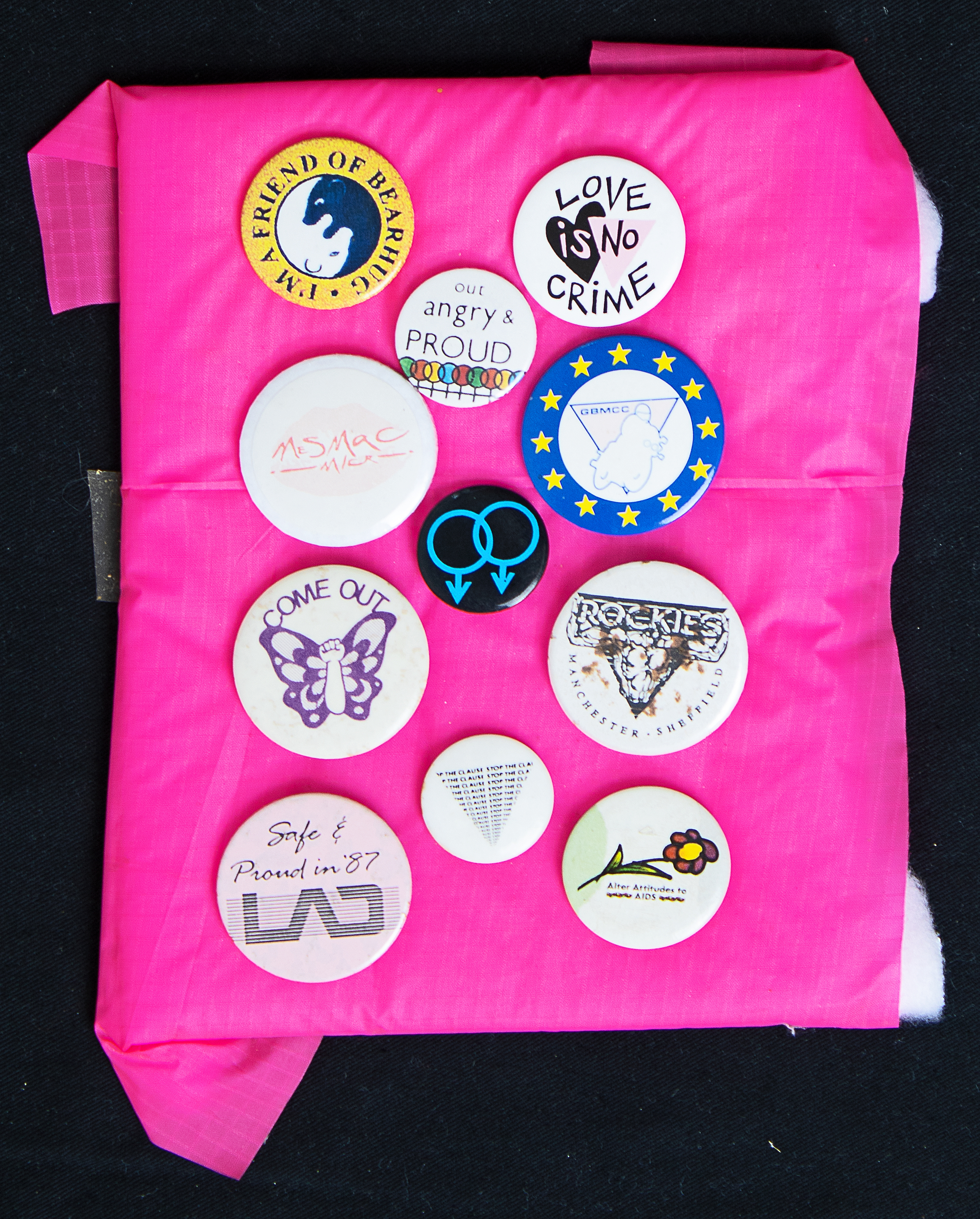 LGTB badges mounted and framed. 11 badges of small and medium size mounted on pink cloth and framed in a home - made cardboard square. The badges are related to events, places and topics, like the gay Night Club "Rockies" in Sheffield and the GBMCC, a club for gay men and women bikers in the UK.