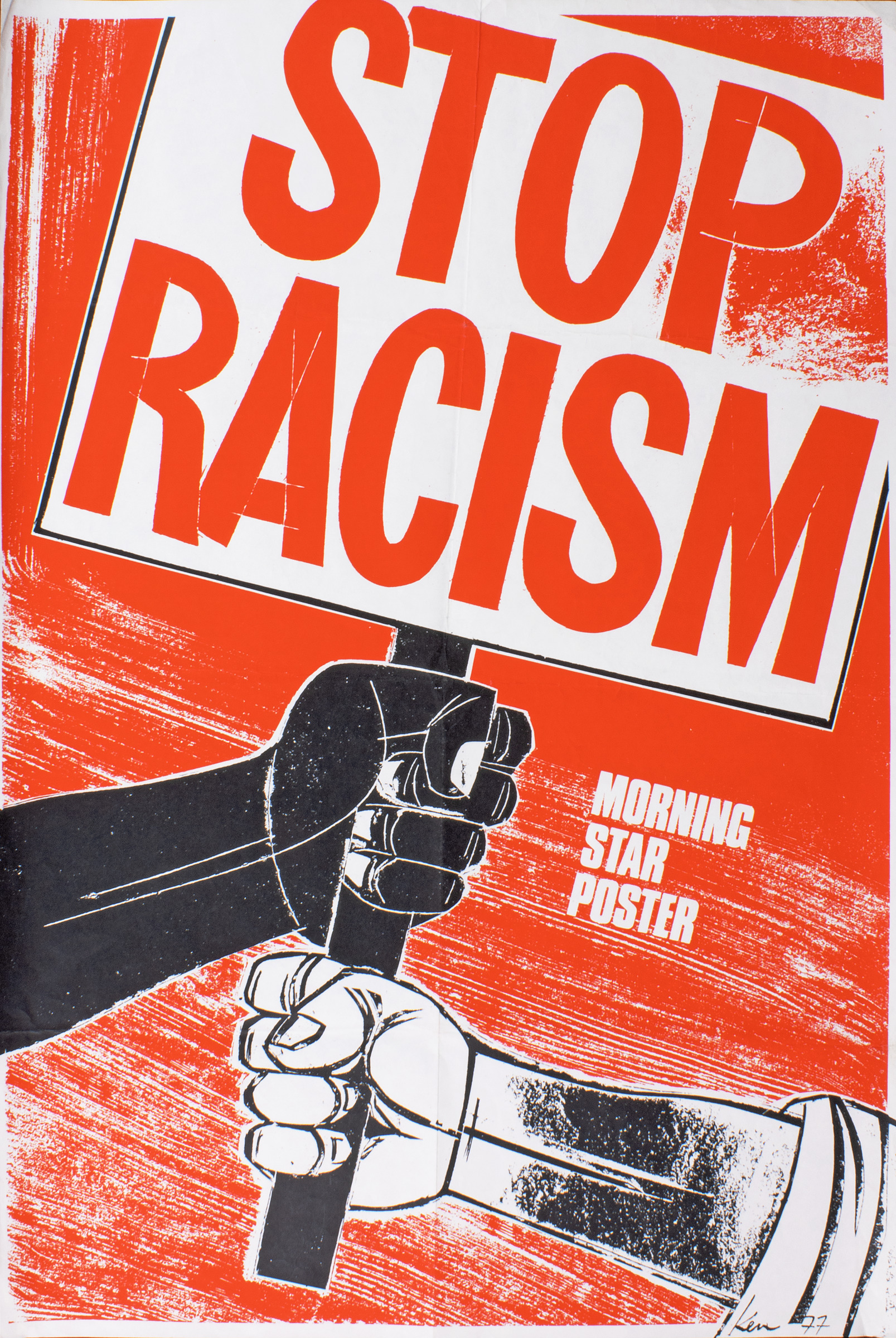 Red poster featuring two hands, one black and one white, holding a white placard that reads "STOP RACISM" in red text, 1977. This is a print of a lithograph by political cartoonist Ken Sprague, published by the Morning Star newspaper. Previously 'The Daily Worker', the Morning Star changed it's name in 1966. It is the longest running socialist publication and was originally set up by the Communist Party of Great Britain in 1930. This print is part of a larger campaign by the Communist Party of Great Britain and the Morning Star publication to combat racism and racial violence. Condition: good