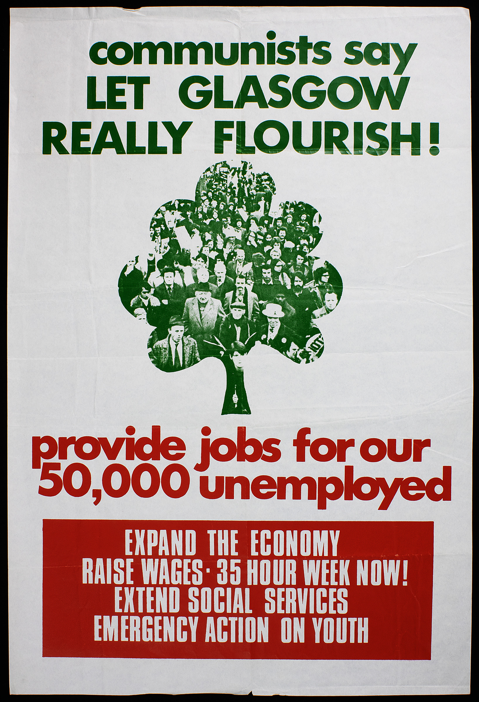 A white poster with green text reading "communists say LET GLASGOW REALLY FLOURISH" featuring a green photograph of a crowd in the shape of a tree. Red text underneath reads "provide jobs for our 50,000 unemployed" and white text in a red box reads "EXPAND THE ECONOMY / RISE WAGES - 35 HOUR WEEK NOW! / EXTEND SOCIAL SERVICES / EMERGENCY ACTION ON YOUTH", around 1960.