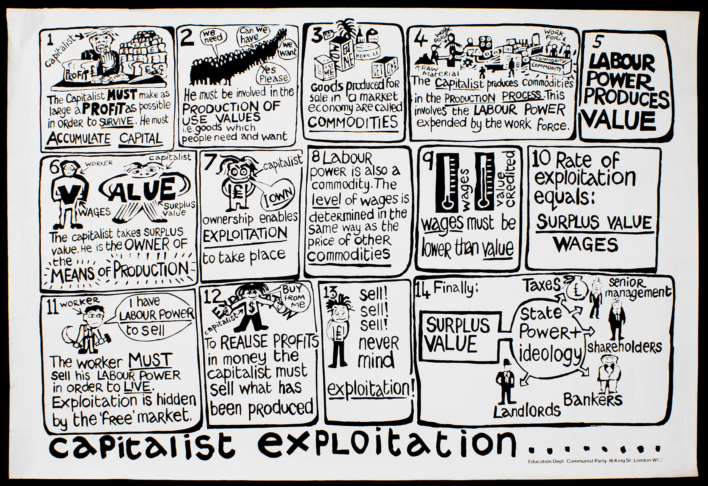 A large white poster produced by the Communist Party's education department, between 1960 and 1990. The poster features a cartoon strip of 14 box panels explaining the system of capitalism through a Marxist lens. Text is as follows: "1. The capitalist must make as large a profit as possible in order to survive" featuring an illustration of a man, labelled 'capitalist', eating bread labelled '£'. "2.He must be involved with the production of use values i.e good which people need and want" featuring an illustration of a crowd saying "we need" and "we want". "3. Goods produced for sale in a market economy are called 'commodities'" featuring an illustration of products labelled 'use me' and 'eat me'. "4.The capitalist produces commodities in the production process. This involves the labour power expended by the work force." featuring an illustration of factory workers labelled 'work