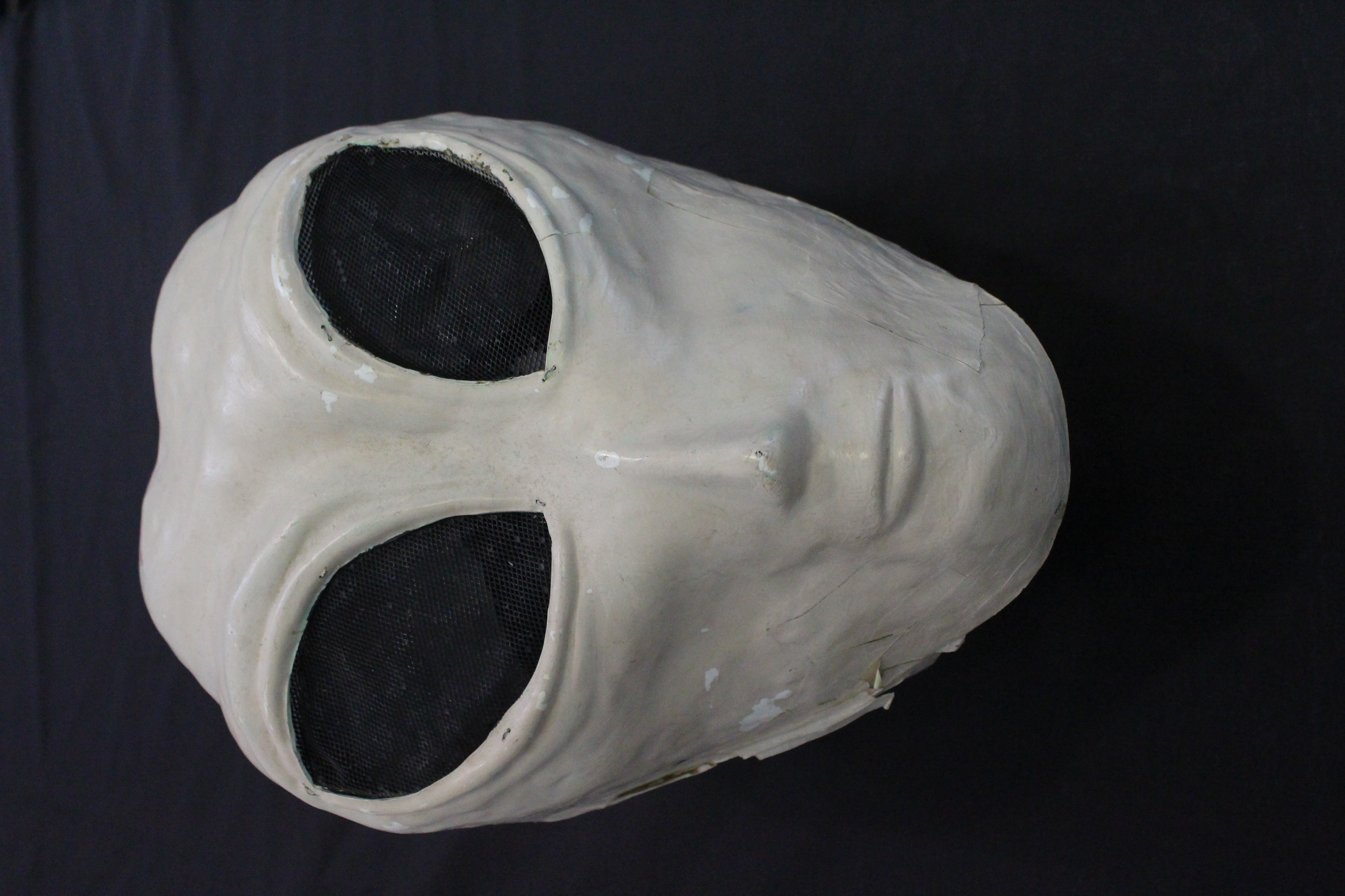 The mask was used for 'No Shop Day' protest street theatre, where 'aliens' were led around the city of Manchester with a guide explaining the surroundings to them. The protest was against consumer capitalism.