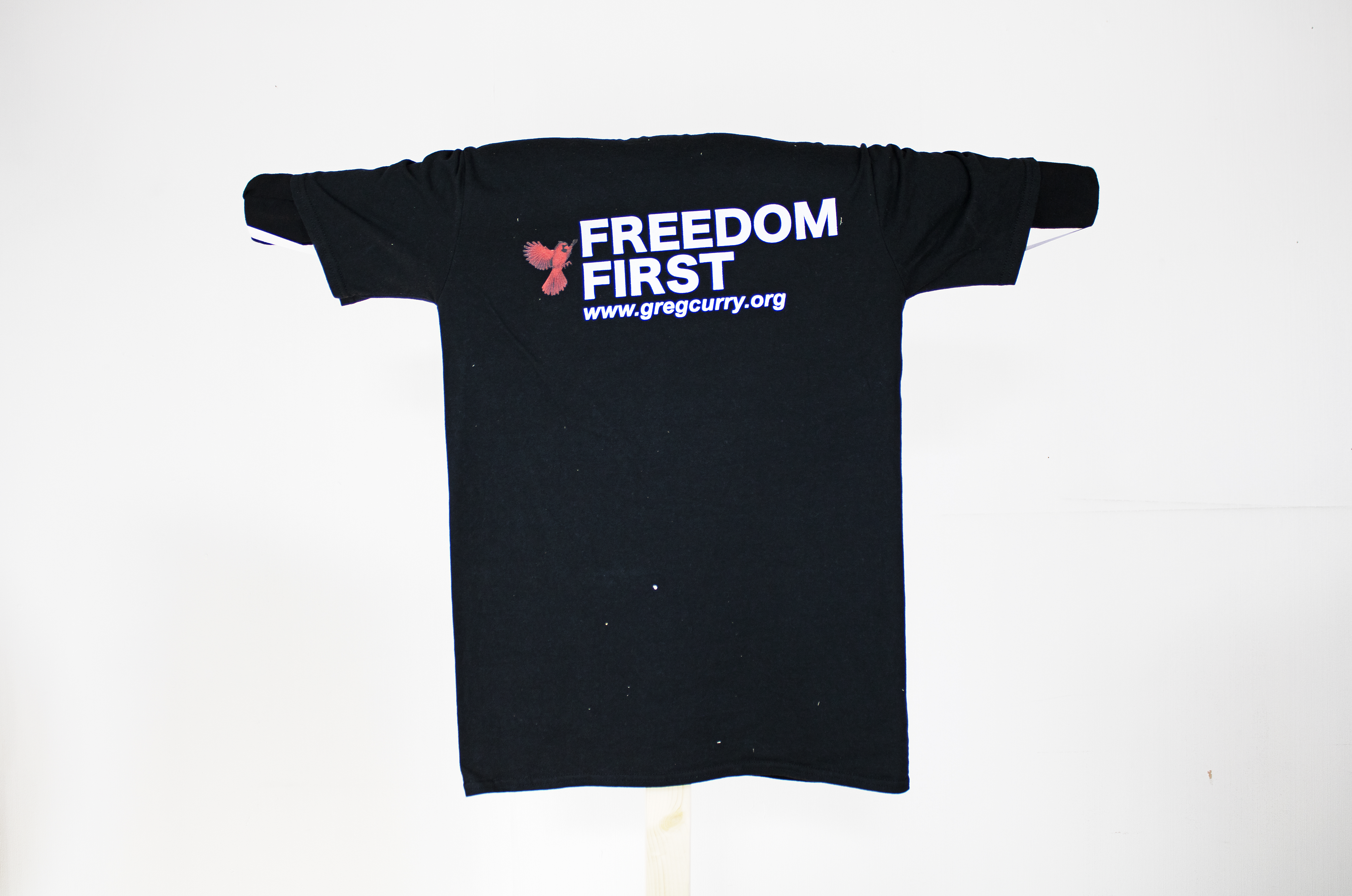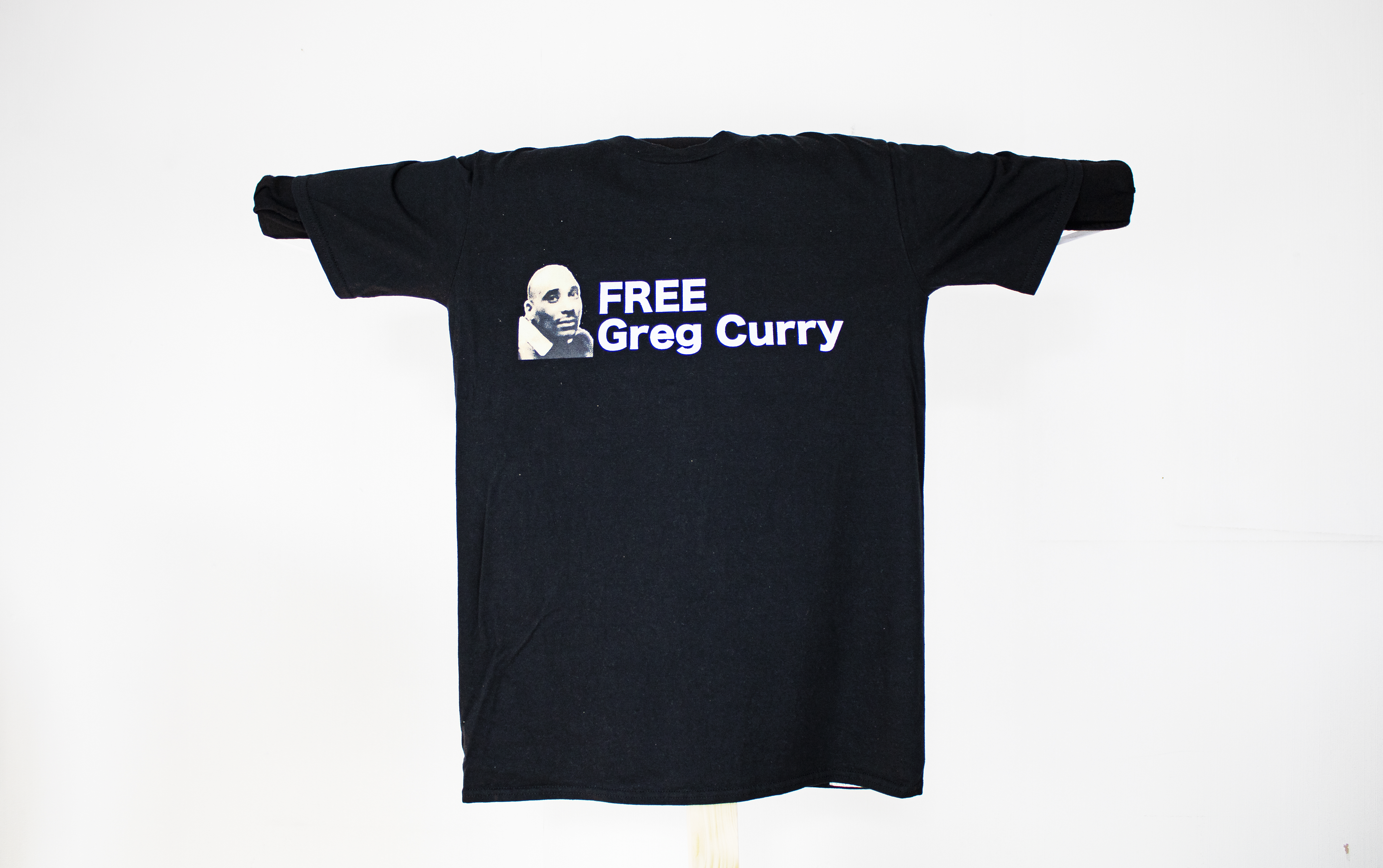 Black t-shirt reading "Free Greg Curry", with an image of Greg Curry's face.