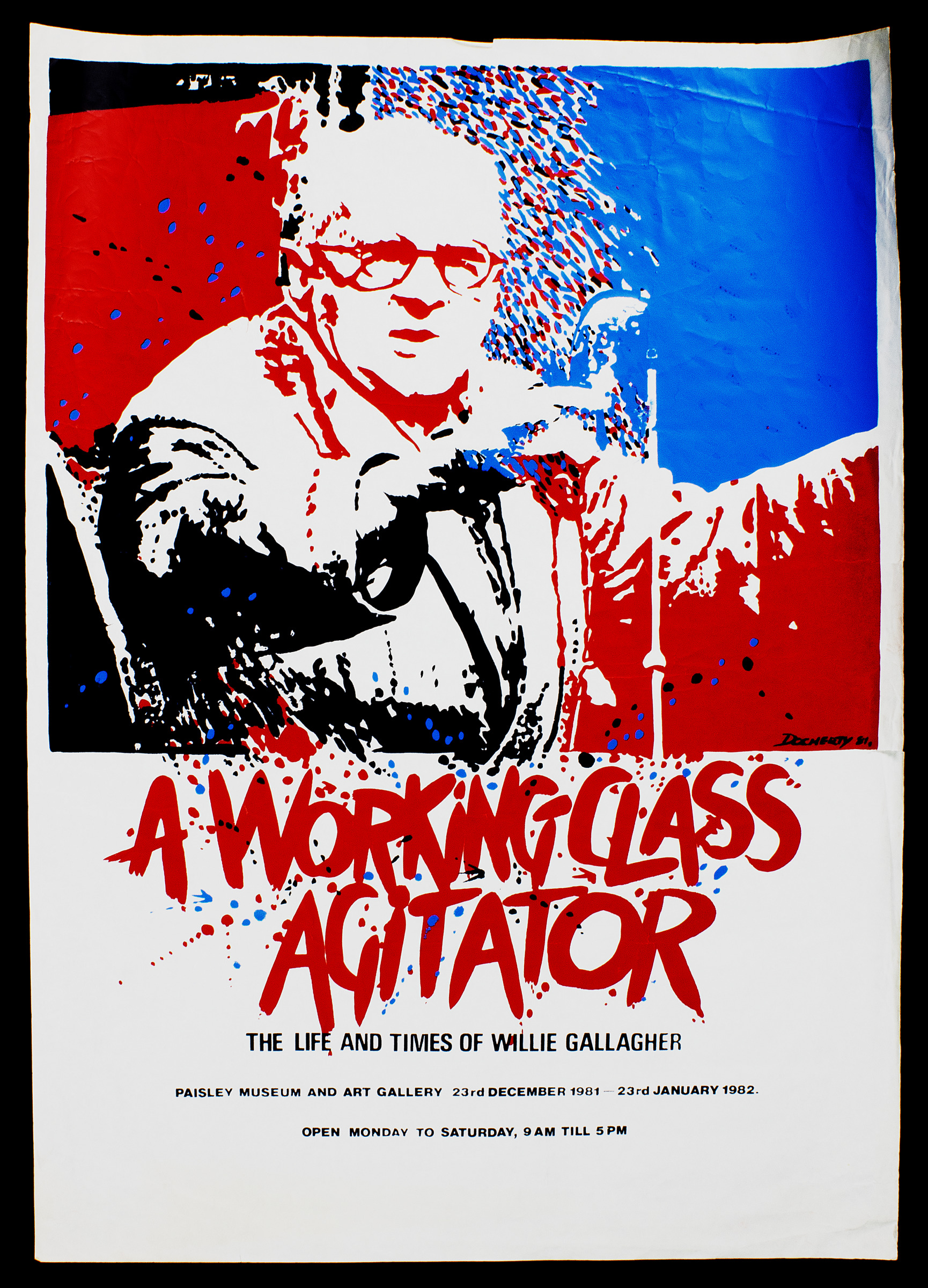 A white poster with red and blue image and black text. The image is of Willie Gallagher, a Scottish trade unionist and one of the founding members of the Communist Party of Great Britain. Gallagher died in 1965 and this poster advertises an exhibition in Paisley, where he lived, looking back at his life and achievements. Red text underneath the image reads "A WORKING CLASS AGITATOR" in a graffiti-like font. Black text underneath reads: "The life and times of Willie Gallagher / Paisley Museum and art gallery 23rd December 1981 - 23rd January 1982 / Open Monday to Saturday, 9AM till 5PM" The print was designed by Docherty in 1981. Condition: good, rough edges and slightly yellowed
