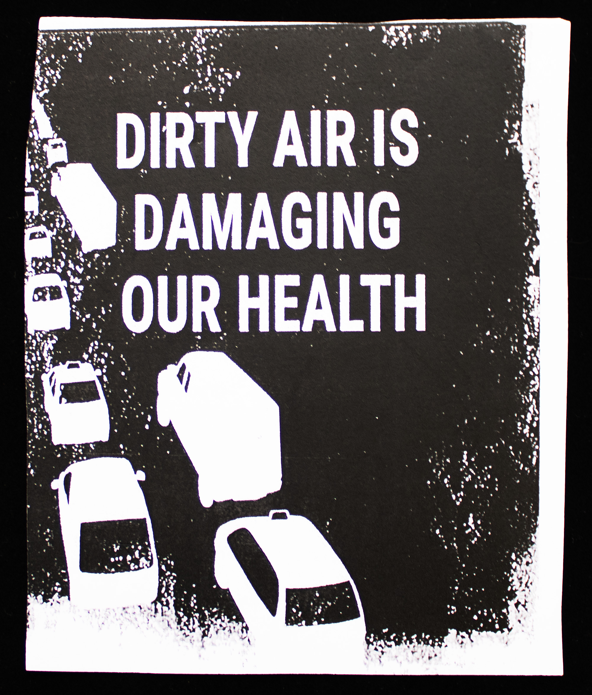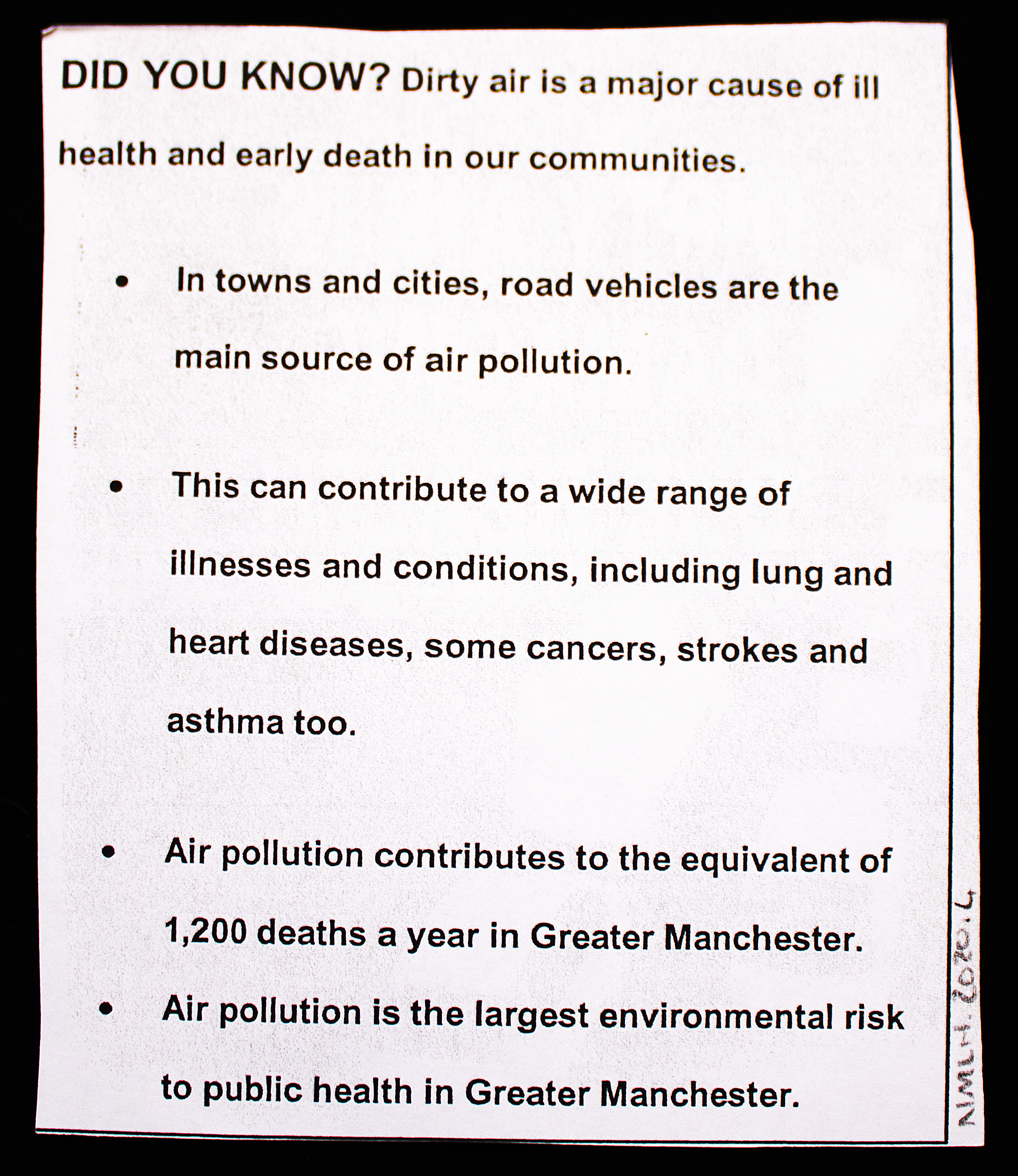 Obverse of the flyer shows cars in a traffic jam in white, on a black background. Reverse of the flyer includes various facts about air pollution and poor health, starting with the phrase "DID YOU KNOW?"