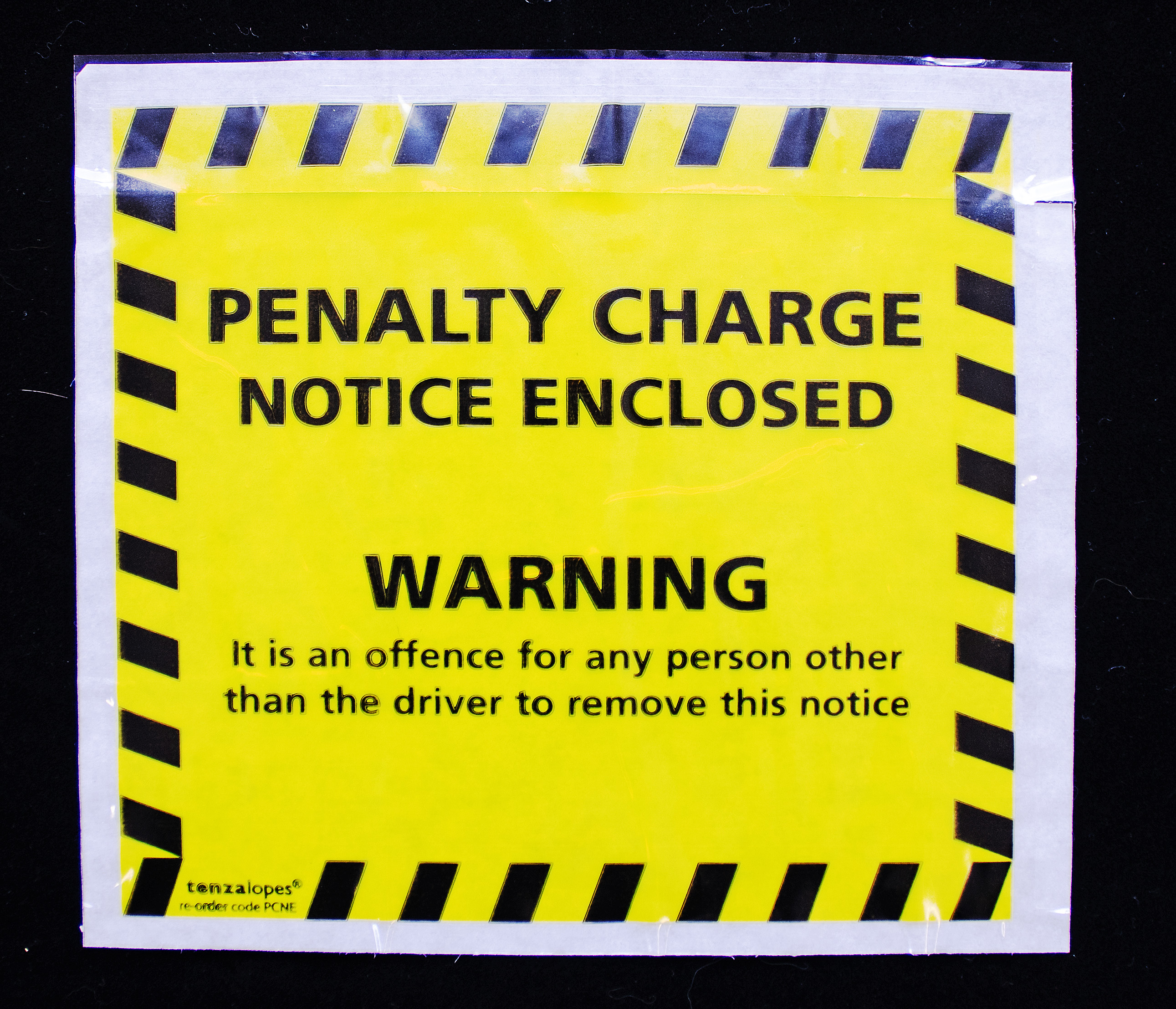 Yellow and black penalty notice envelope, like those used to issue car parking fines by councils, which were used to post the flyers in NMLH.2020.35 to cars parked dangerously near Russell Scott Primary School