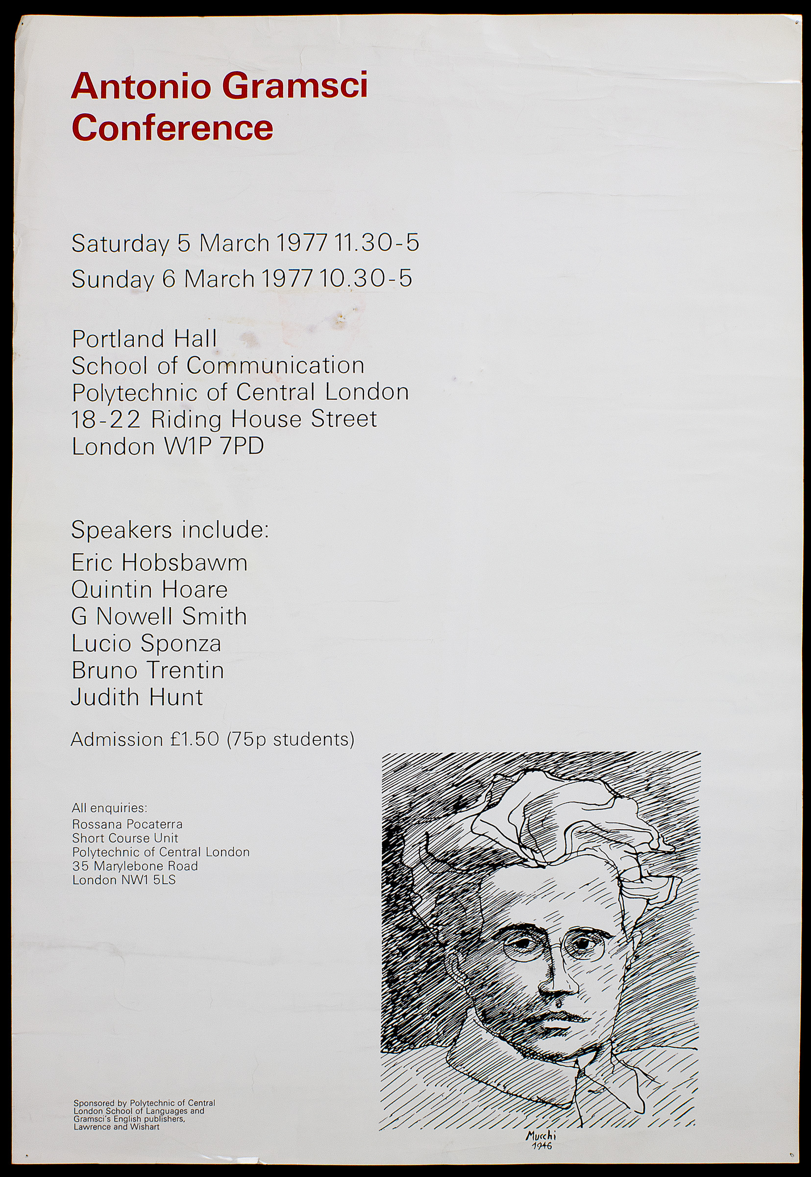 A white poster advertising the Antonio Gramsci conference, a conference held by the Polytechnic of Central London celebrating Antonio Gramsci's works. Antonio Gramsci was an Italian Marxist philosopher whose ideas held influence in the Communist Party of Great Britain. The poster features a sketch drawing of him by Mucchi (1946) in the bottom right hand corner. Text on the poster reads: "Antonio Grmsci Conference / Saturday 5th March 1977 11:30-5 / Sunday 6th March 1977 10:30-5 / Portland Hall / School of Communication / Polytechnic of Central London / 18-22 Riding House Street / London W1P 7PD / Speakers include: / Eric Hobsbawne / Quintin Hoare / G Nowell Smith / Lucio Sponza / Bruno Trentin / Judith Hunt / Admission £1.50 (75p students) / All enquiries: Rossana Pocaterra / Short Course Unit / Polytechnic of Central London / 35 Marylebone Road / London NW1 5LS" Smaller text at the bottom reads "Sponsored by Polytechnic of Central London School of Languages and Gramsci's English