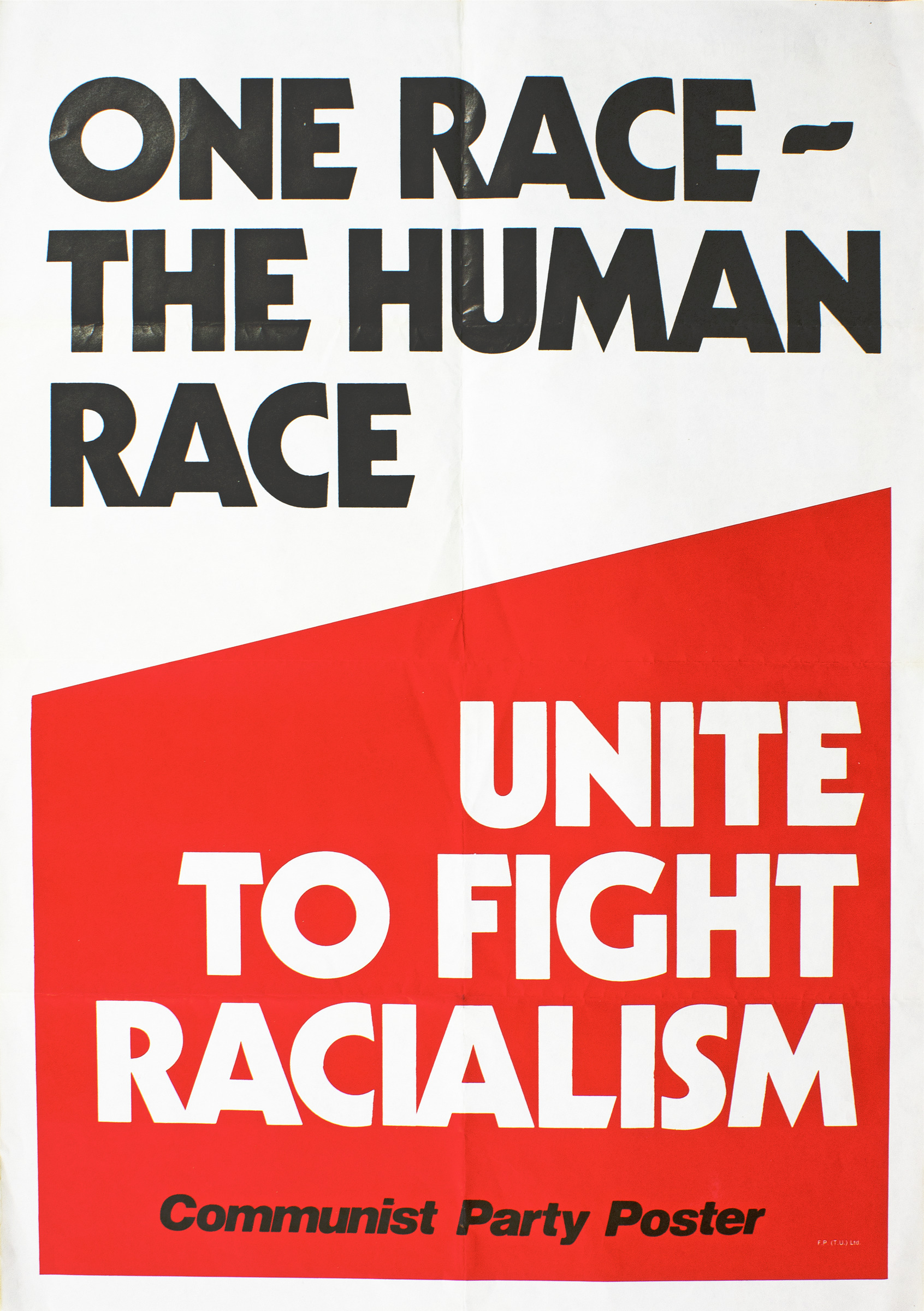"ONE RACE- THE HUMAN RACE" in large black letters printed on white paper. "UNIT TO FIGHT RACIALISM" in large white letters in negative space of red quadralatral. "COMMUNIST PARTY POSTER" in small black letters underneath, printed on top of red quadtralateral.