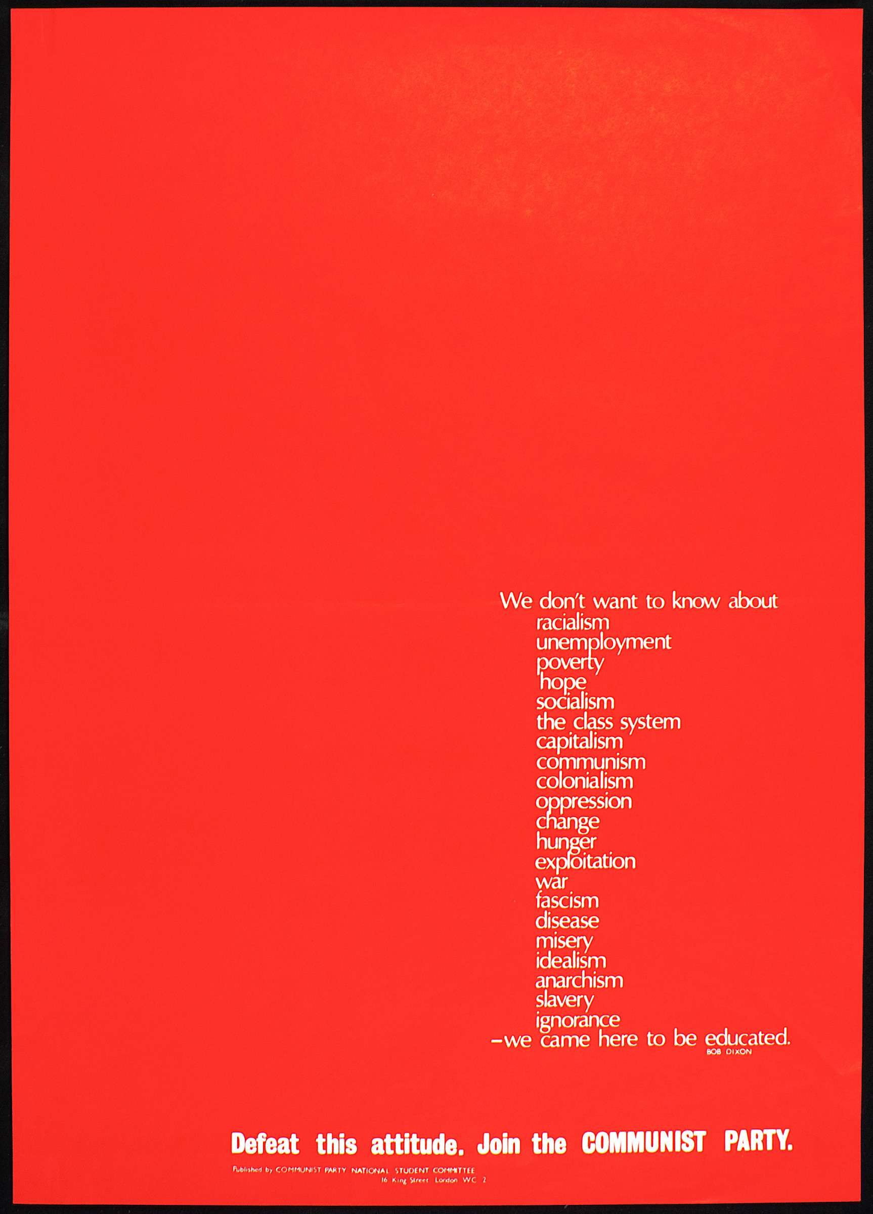 Red paper poster printed with white text "We don't want to know about racialism, unemployment, poverty, hope, socialism, the class system, capitalism, communism, colonialism, oppression, chnge, ungerm exploitation, war, facism, disease, misery, idealism, anarchism, slavery, ignorance - we came here to be educated". The line "Defeat this attitude, Join the COMMUIST PARTY." can be found bolde on the bottom of the poster.