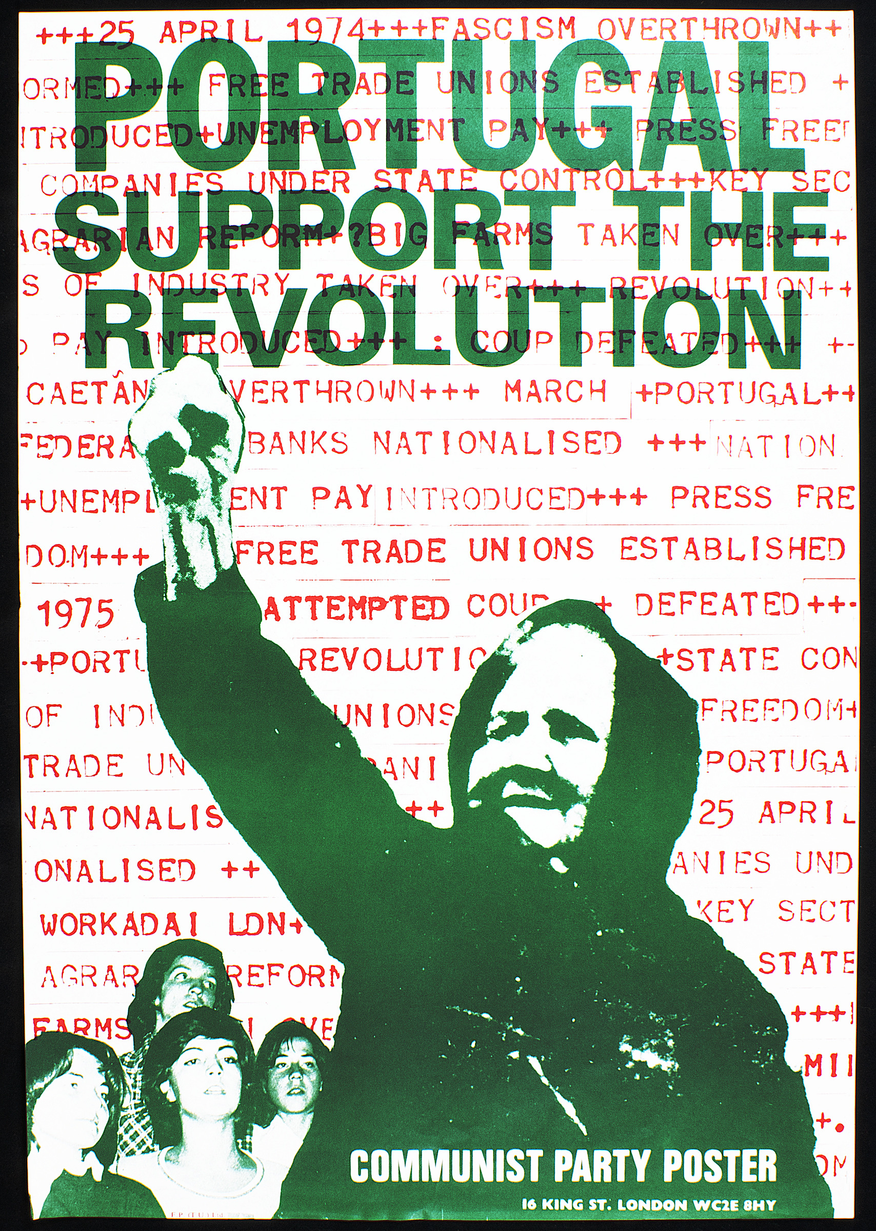 "PORTUGAL SUPPORT THE REVOLUTION" in large forest green text at top of poster in lower portion of white paper is a large screenprinted image of an older woman with a raised fist with smaller image of 4 young people to her left, all also in forest green. In classic printing press/type writer font in red ink is repeated text of important dates, events, and goals of the communist party. In negative space in the image of the older women in smaller white text reads"COMMUNIST PARTY POSTER"