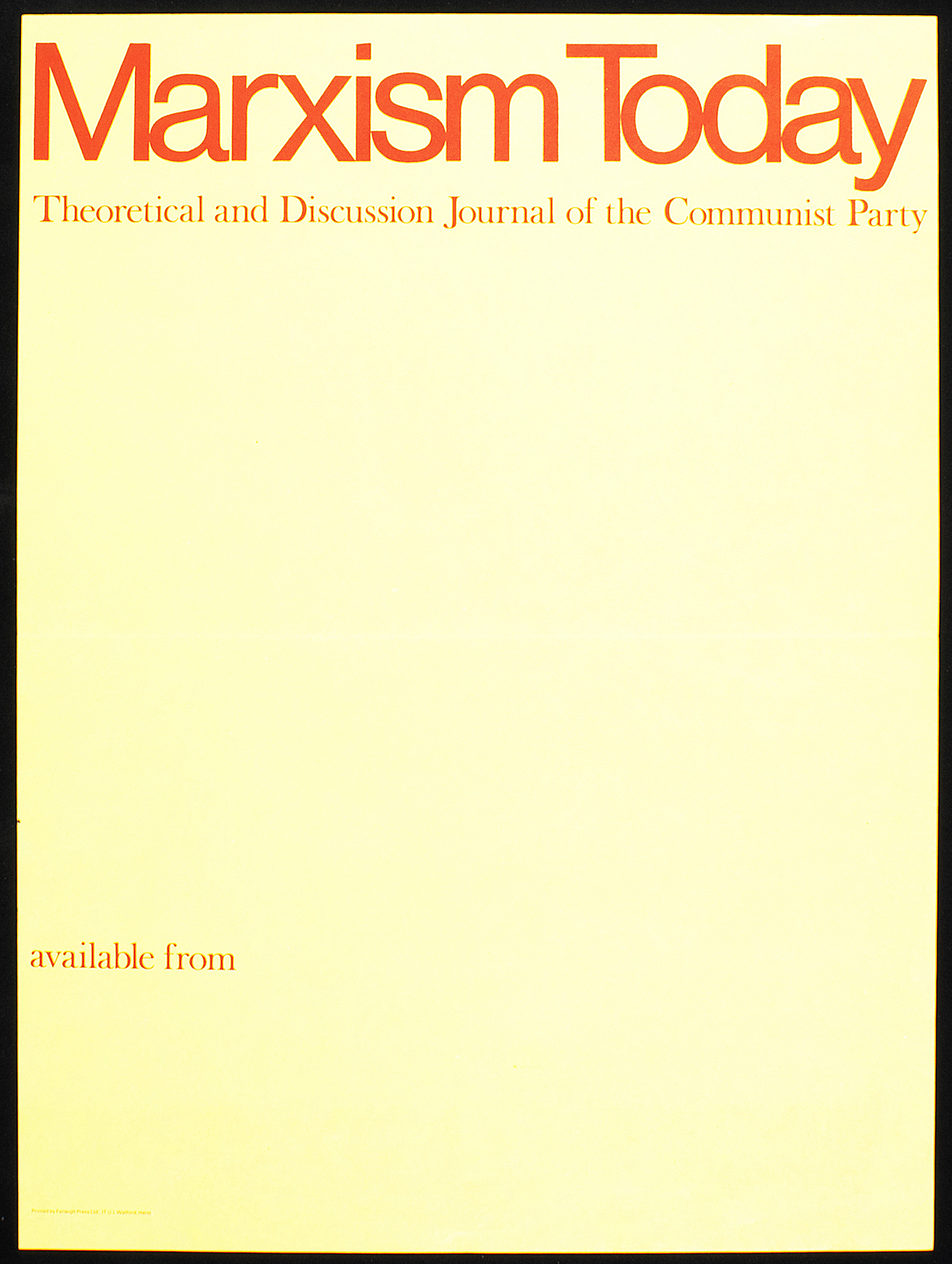 Poster printed on a cream yellow paper with text 'Marxism Today Thoretical and Discussino Journal of the Communist Party' in red at the top and 'available from' in red at the bottom. Printd by Farleigh Press Ltd. (T.U.)Watfor, Herts.