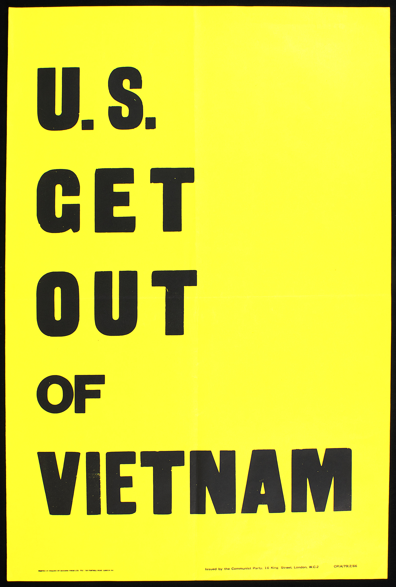 Poster printed on a yellow paper with text 'U.S. GET OUT OF VIETNAM' in black. Issued by the Commuist Party, 16 King Street, London, W.C.2 CP/A/79/2/66. Printed in England by Goodwin Press Ltd (TU), 135 Fonthill Road, London N4.