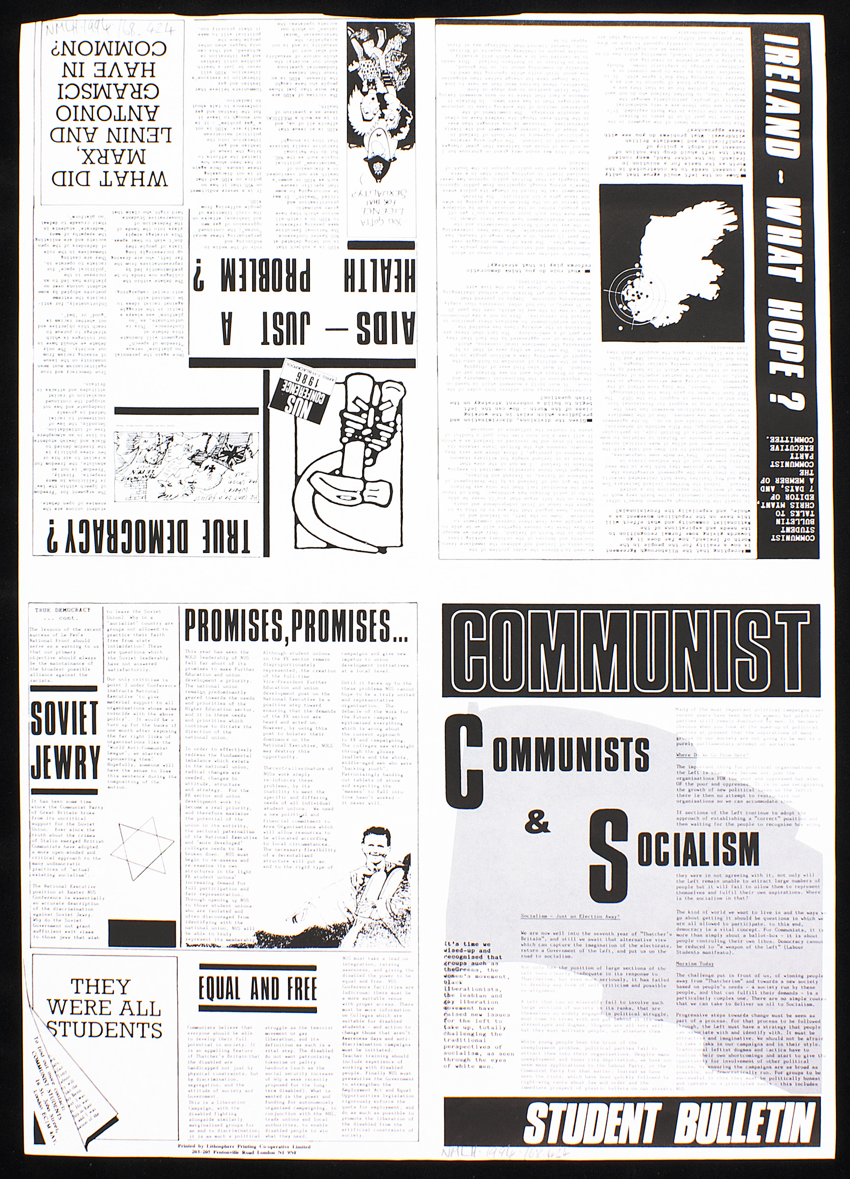 Poster printed on a paper with black backgound with an image of Karl Marx sitting on a chair with his left hand on his lap and right hand into his suit jacket. A square lapel badge with 'COMMUNIST STUDENT', with 'STUDENT' underlined. Published by Communist Students 16 St. John Street, London EC1M 4AY and printed by Lithosphere Printing Co-operative Limited 203-205 Pentonville Road N1 9NF.