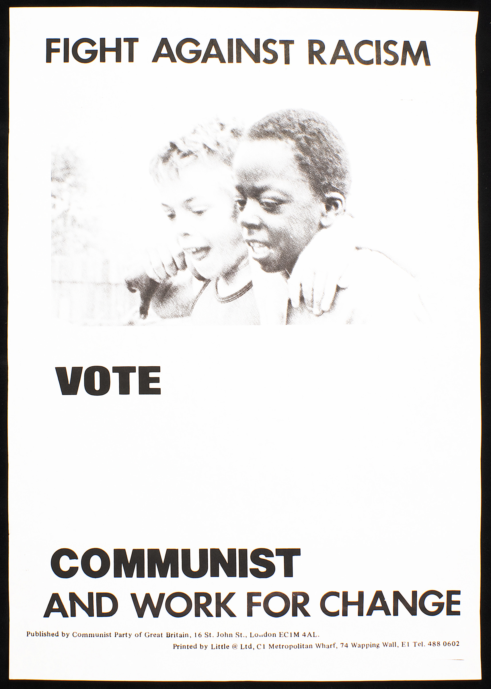 Printed on a white paper, with an image of two young children, one with lighter skin tone and the other with a darker one, walking together with arms around each other's necks and shoulders. Under the image, text 'Vote Communist and work for change' is printed in black, with a large space in between the lines of 'vote' and 'communist'. Published by Communist Party of Great Britain, 16 St. John St., London EC1M 4AL. Printed by Little @ Ltd, C1 Metropolitan Wharf, 74 Wapping Wall, E1 Tel. 488 0602.