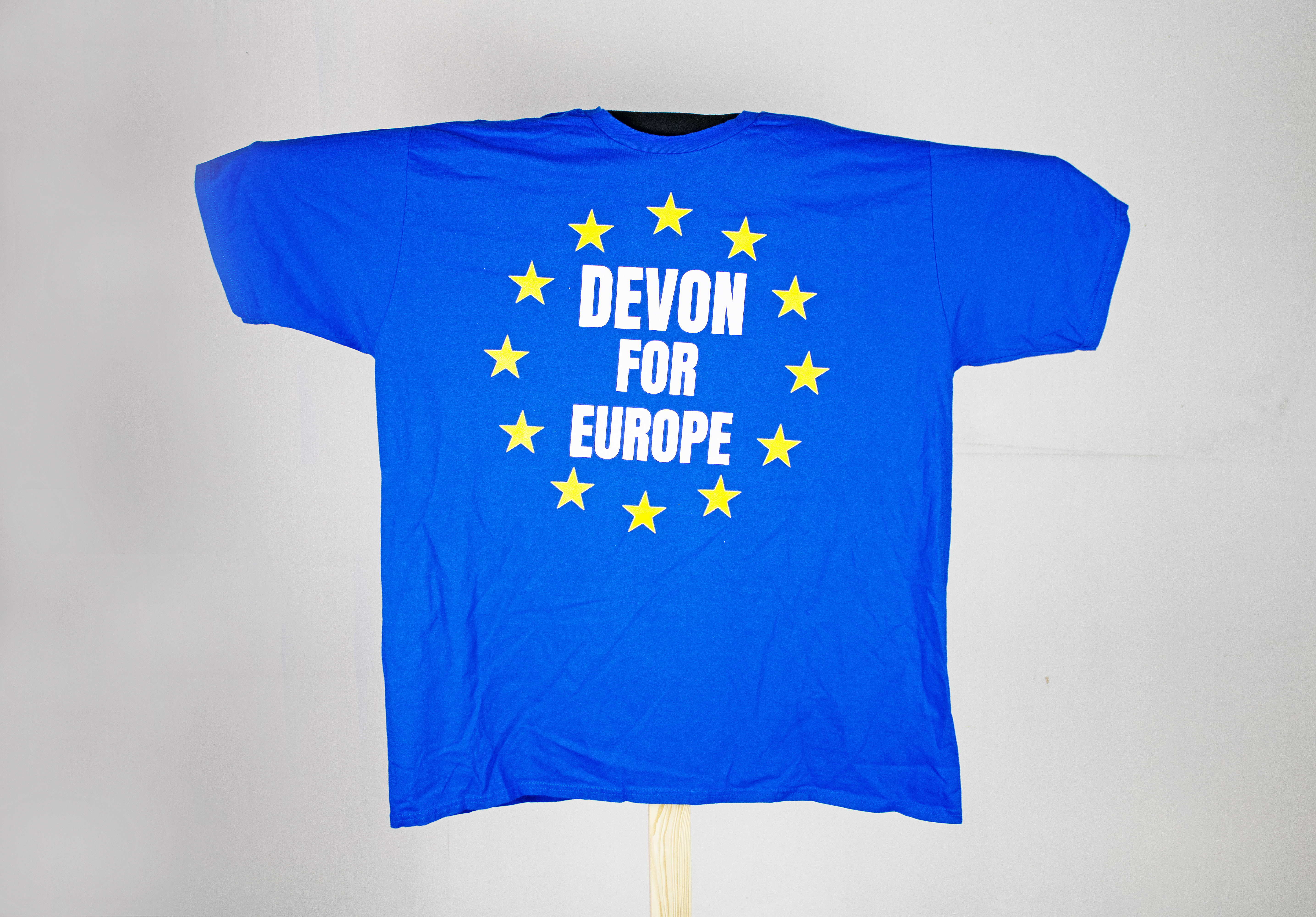 This is a blue t-shirt reading "Devon for Europe" surrounded by the stars that make up the EU flag. It was worn on the People's vote march in London on 19th October 2019.