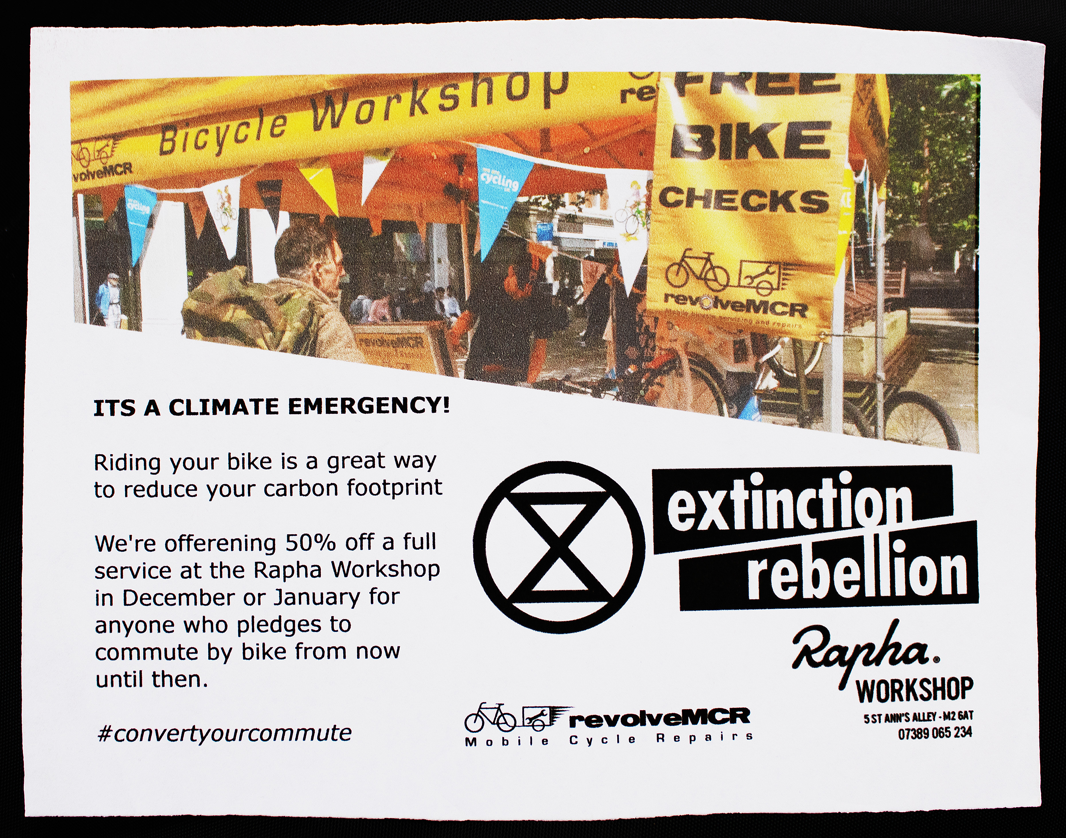 An Extinction Rebellion leaflet advertising bicycle workshops, encouraging people to cycle to work rather than drive.