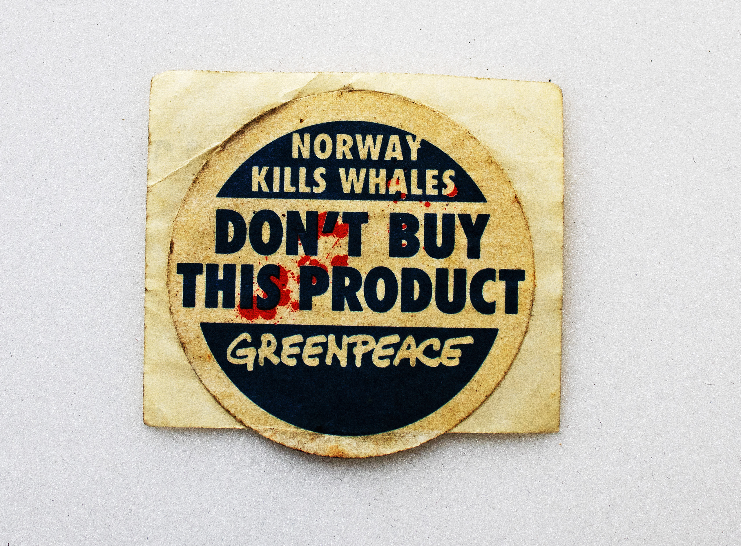This sticker is blue and white with a splatter of red to indicate blood. These three colours also make up the Norwegian flag. At the top the badge reads "Norway kills whales" in white text on a blue background. The words "Don't buy this product" are printed in the middle of the sticker in blue text on a white background. The Greenpeace logo is printed at the bottom, in white text on a blue background. The red blood spatter covers the sticker diagonally.