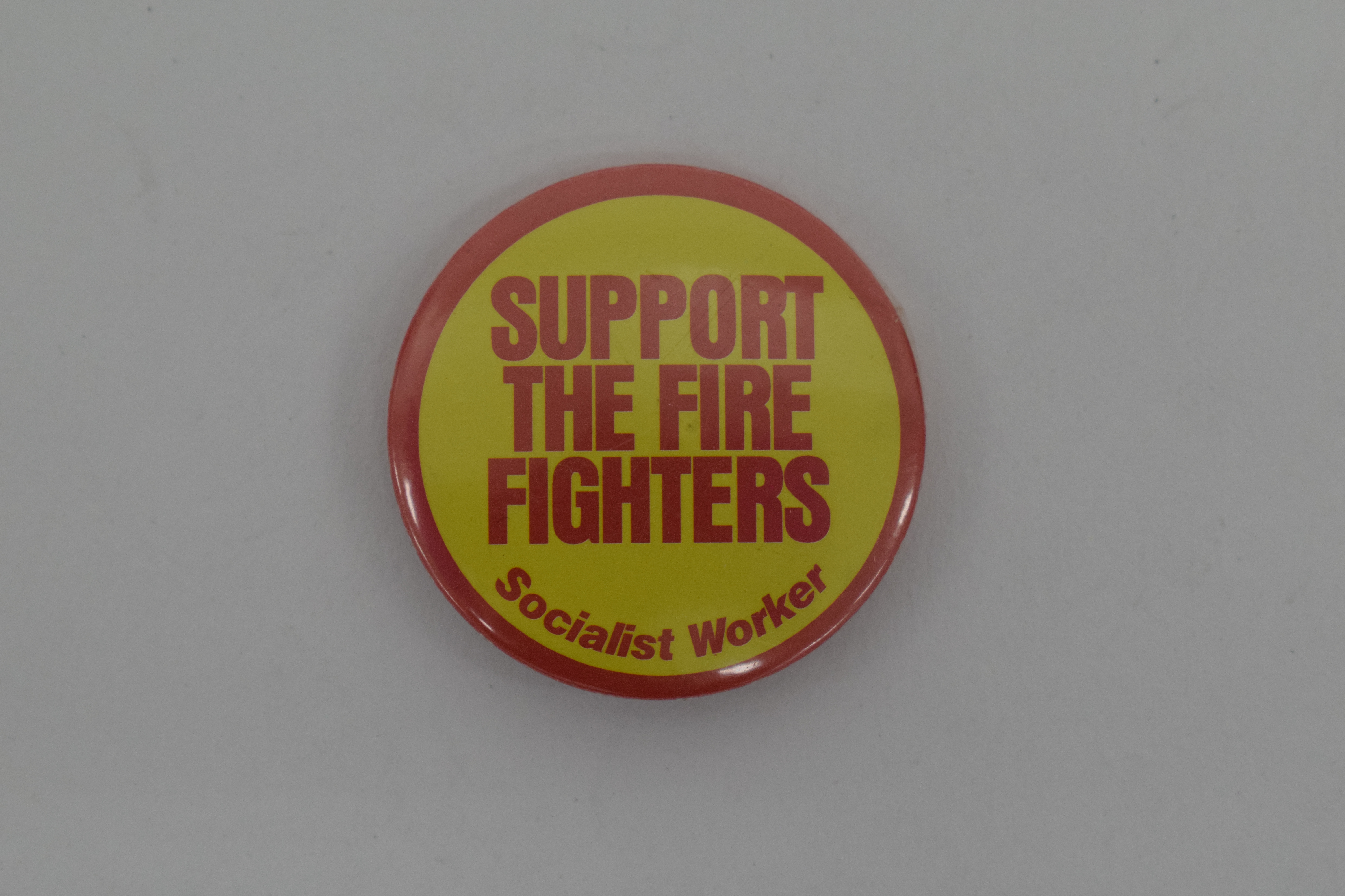 The Socialist Worker Party was founded in 1977. There was a signifant firefighter strike from 2002-2003 which is likely related to this protest badge. This was when the Fire Brigades Union (FBU) voted to take strike action for a better salary - the FBU demanded a 39% increase in pay. Industrial action began in November. The strike was led by Andy Gilchrist, the Fire Brigades Union general secretary - he is a British trade unionist and was a member of the General Council of the Trades Union Congress.