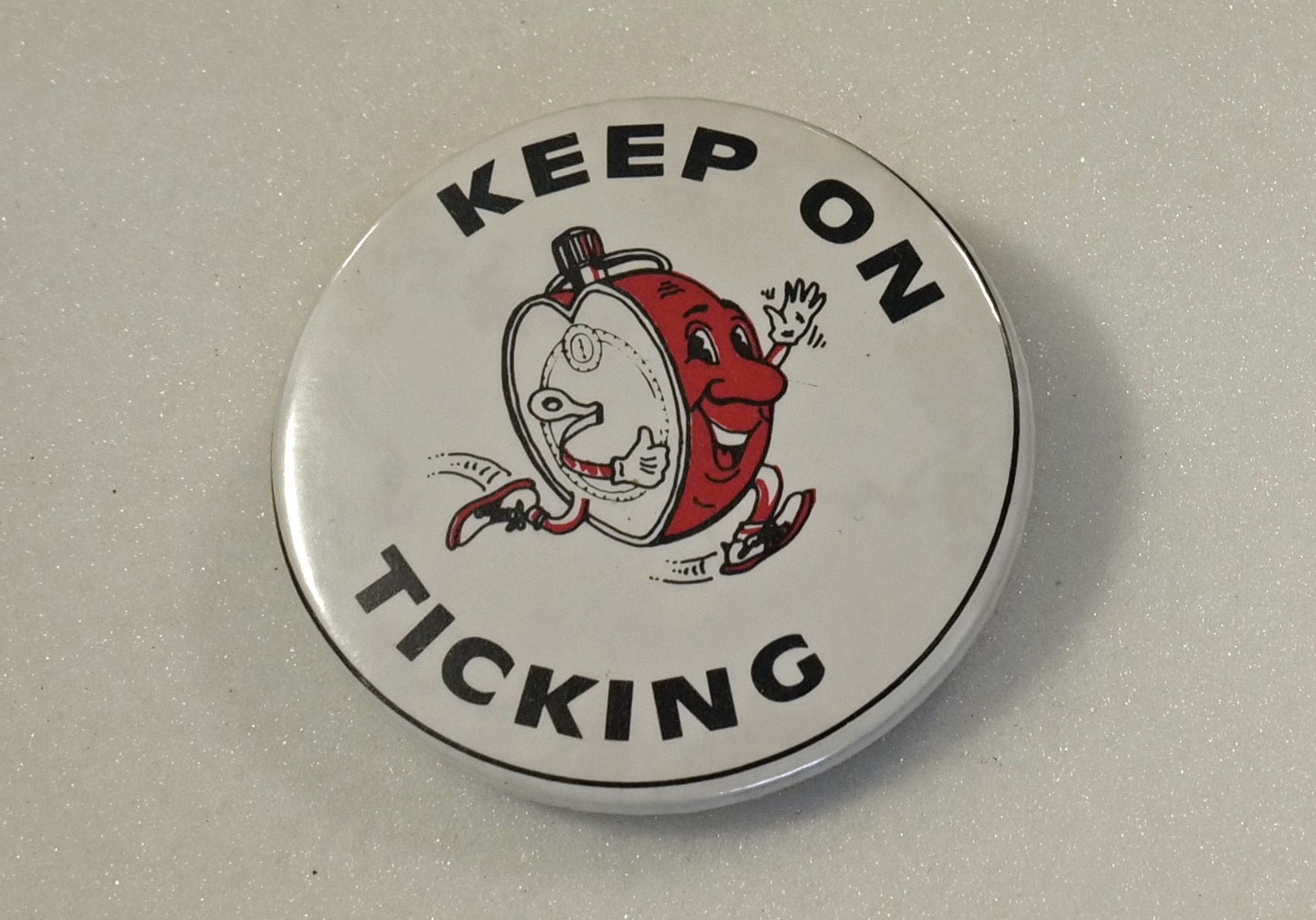 A white plastic button badge with a cartoon of a stopwatch shaped like a heart and the words 'Keep on ticking'.