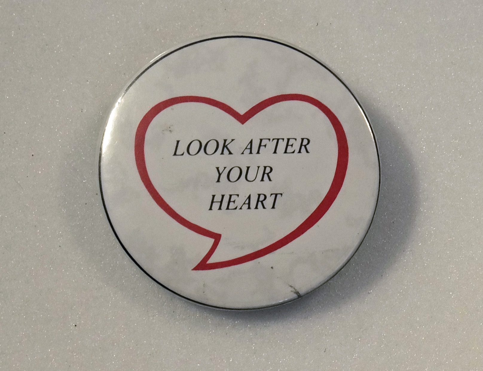 A white plastic button badge with an outline of a red heart. The words "Look after your heart" are printed in black itallic text within the heart. A thin black border surrounds the image. The badge has a metal back with a pin fastening.