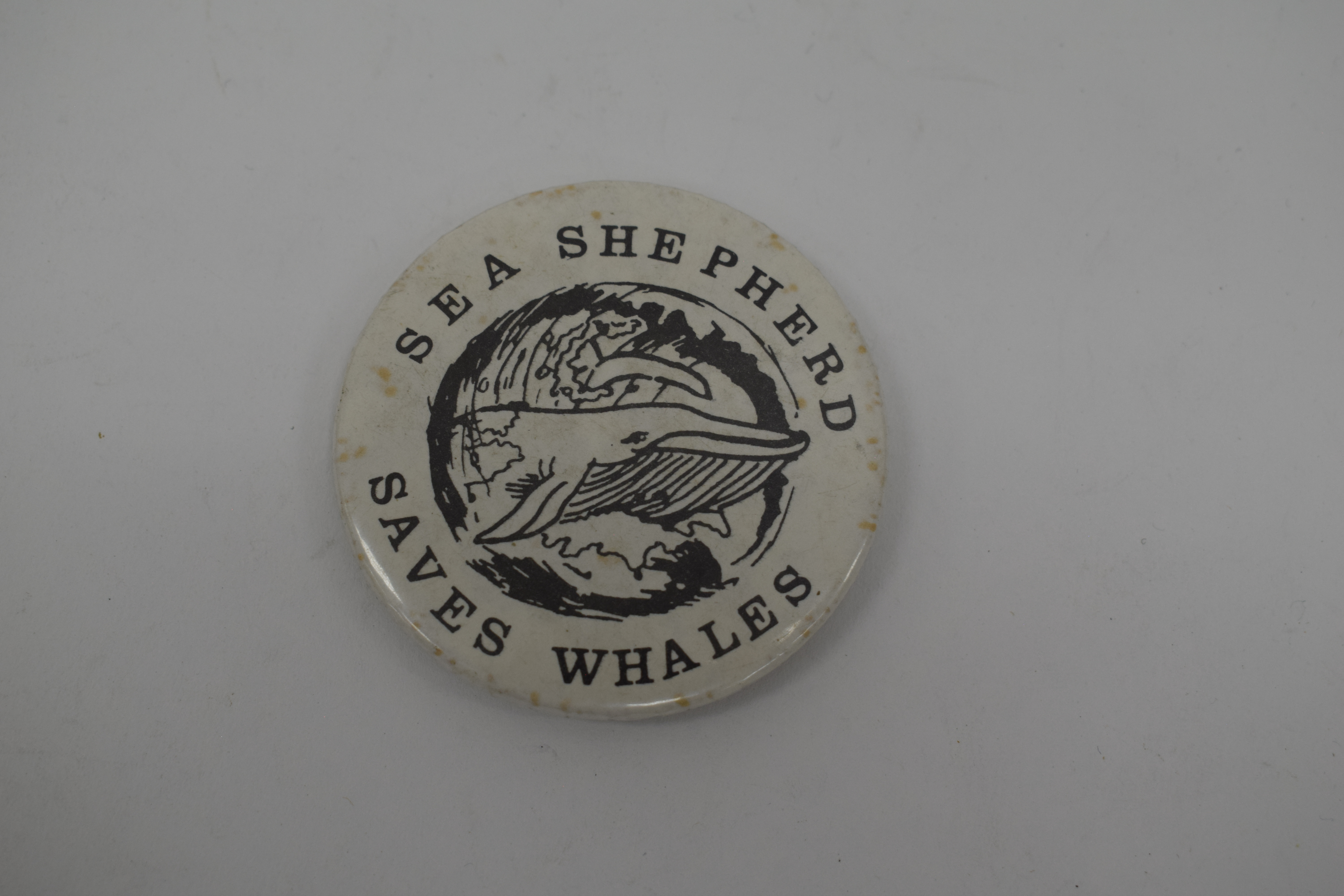 A large button badge produced by Sea Shepherd, "Sea Shepherd - Saves Whales" in black text around an illustration of a whale. On the back of the badge a rubber ring surrounds the plastic backing. The badge has a metal back with a pin fastening.