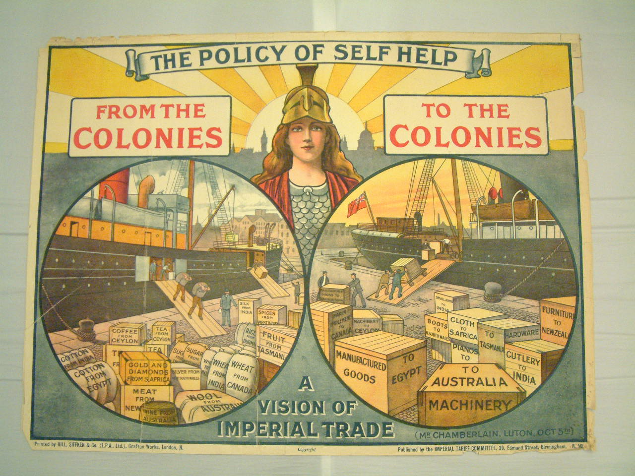 In this poster the Toriesâ tariff reform policy of this period (around 1910) is set out graphically. Britannia is seen in front of a brilliant sun with Britain drawing in raw materials from its Empire and exporting manufactured goods to pay colonial producers. High tariffs or taxes are charged to foreign countries, deterring them from trading with the British Empire.