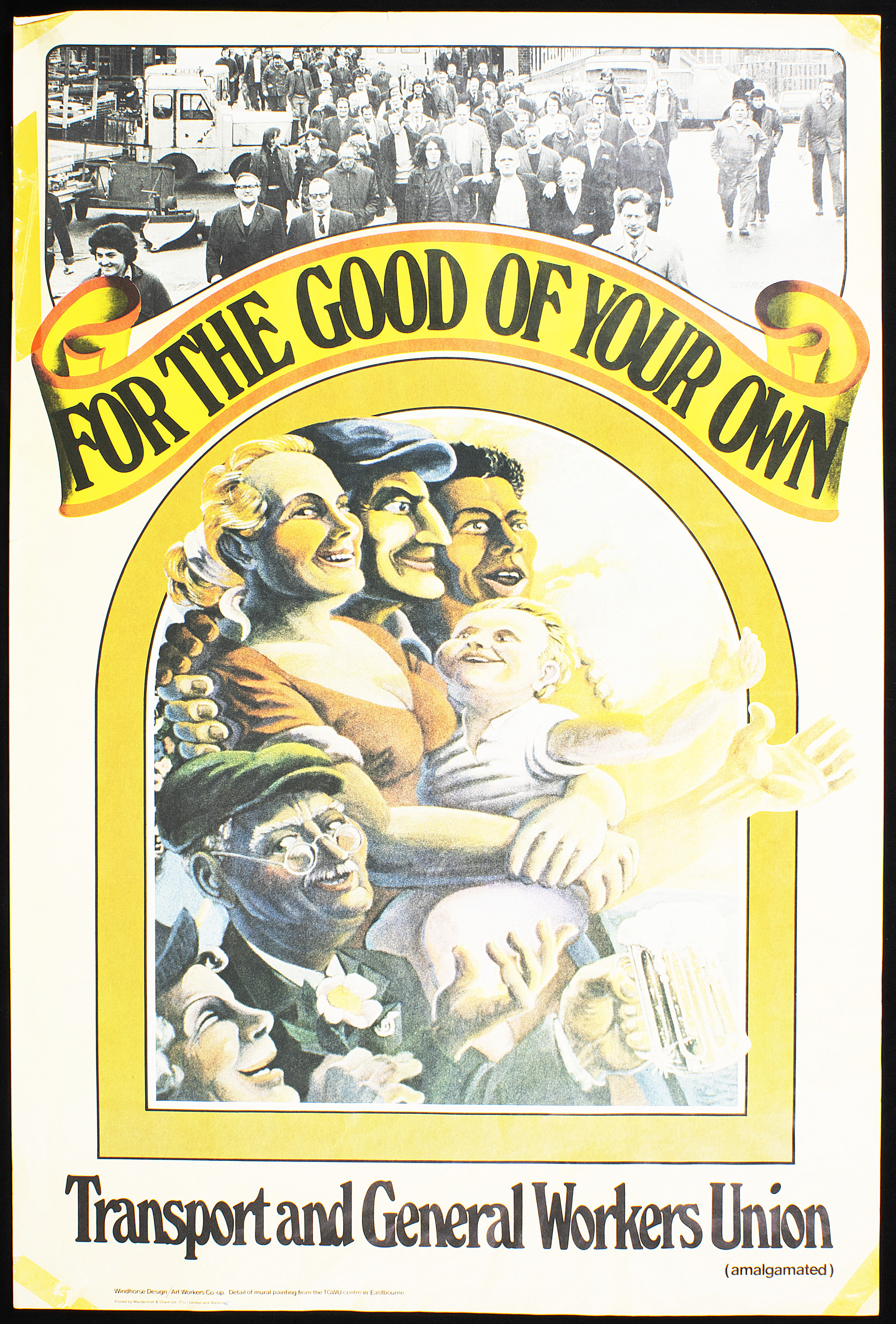 top of the poster there is a black and white photograph of workers, both in suits and casual dress, underneath which 'for the good of your own' is written in black text inside a yellow ribbon. Black text at the bottom of the poster reads 'Transport and General Workers Union'. The poster was designed by Windhorse and printed by Macdermott and Chant. Condition: There are tape marks on the corners of the poster. A small strip of tape remains attached to the upper left side. The back has marks from where blue tack has been used. The poster is slightly yellowed in appearance.