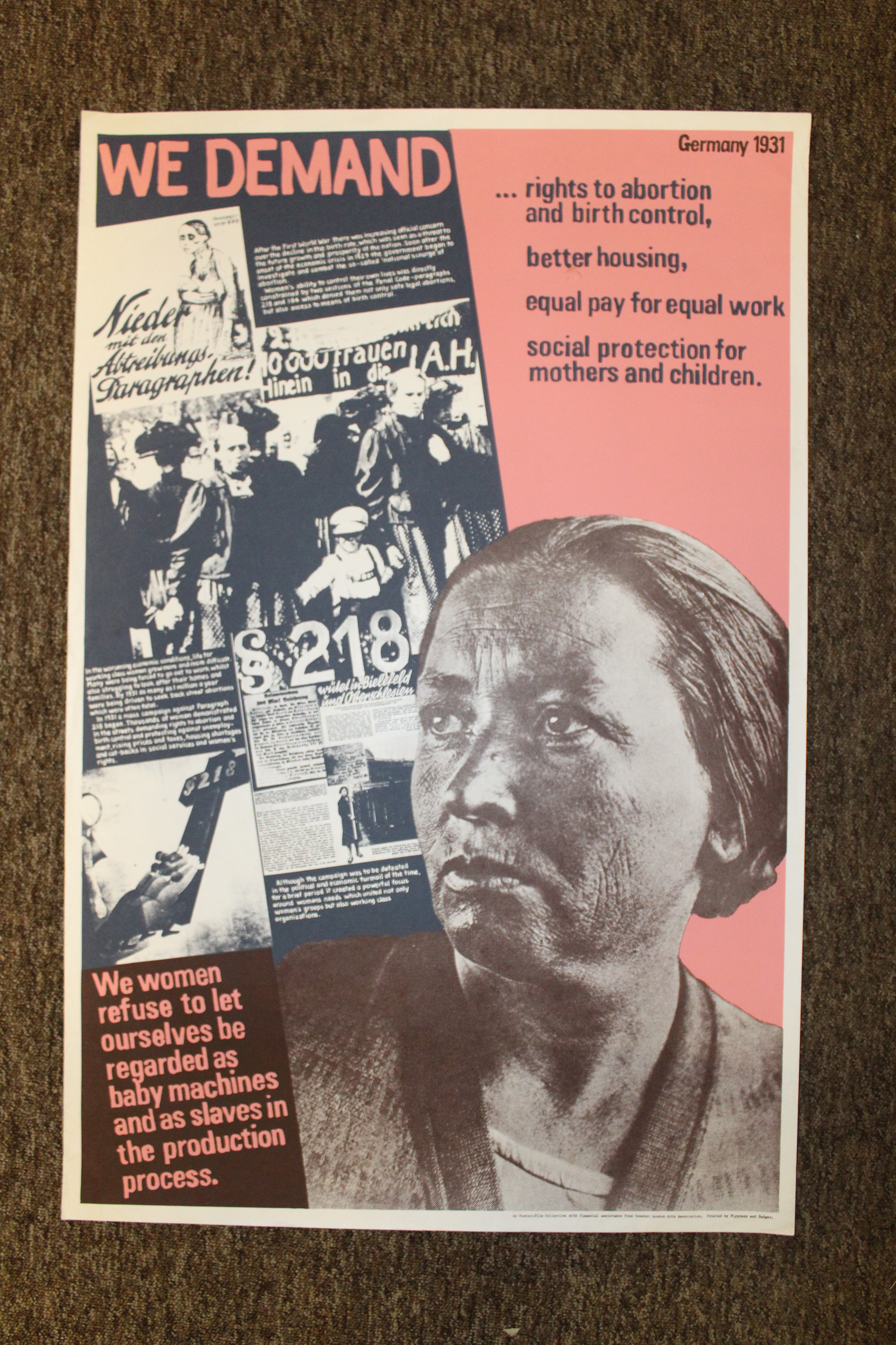 A large poster. Pink, blue and black and white with a white border. Says 'WE DEMAND..rights to birth control, better housing, equal pay fir equal work, social protection fot mothers and children.' Bottom left says 'We women refuse to let ourselves be regarded as baby machines and as slaves in the production process.' Poster was produced in Germany 1931, and has more information in smaller print about the mistreatment of women. Particularly about the economic decline in 1929 and the govenment's aims to prevent abortion. The information discusses back street abortions, poor economic conditions and birth control. United women's groups and working class groups.