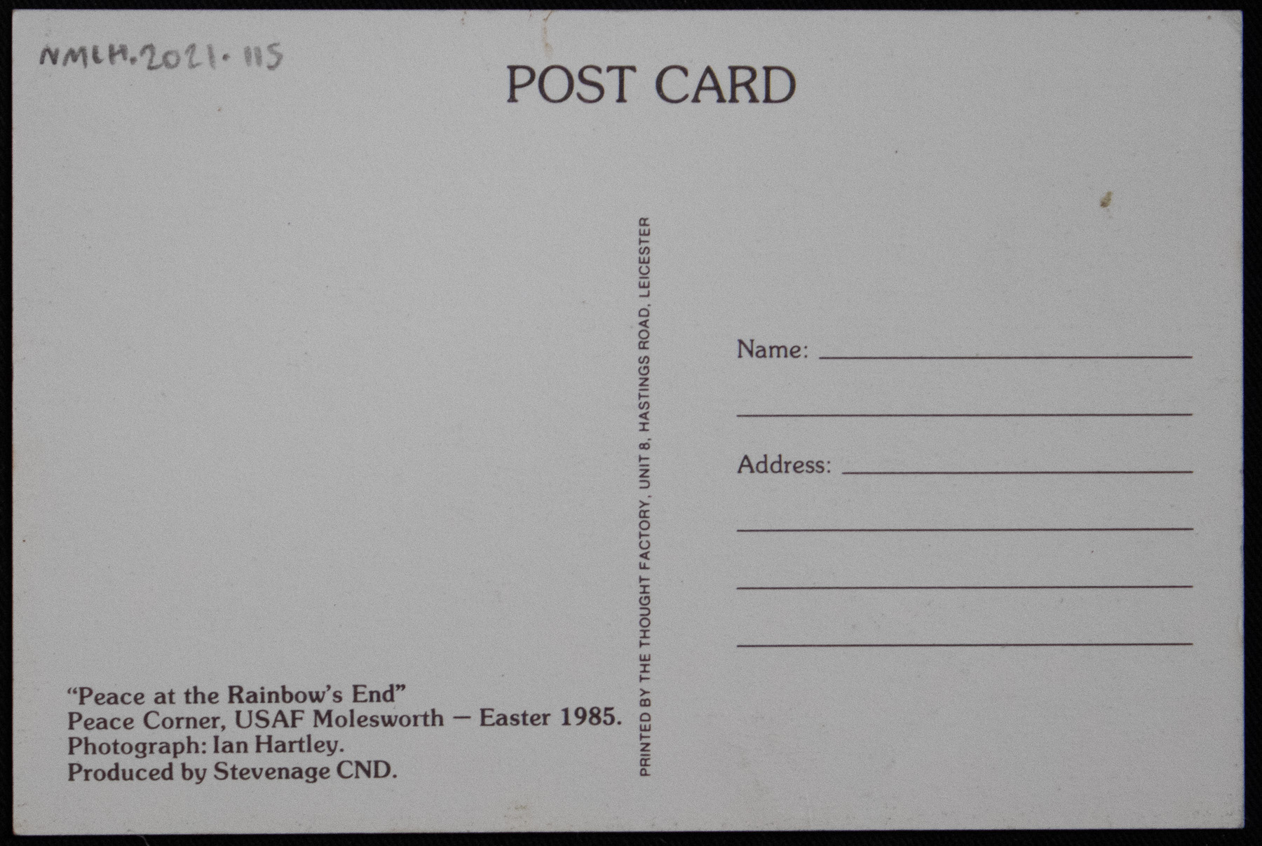 This postcard features a photo of the protest camp at Peace Corner. It was taken in April 1985, just before the eviction of the camp. In the photo, the camp lies in the foreground and a rainbow can be seen in the background. The photo is titled "Peace at the Rainbow's End" and information on the back of the card tells us is was taken by Ian Hartley, a Quaker who lived at the camp during the 1980's. The postcard was printed by The Thought Factory and produced by Stevenage CND.