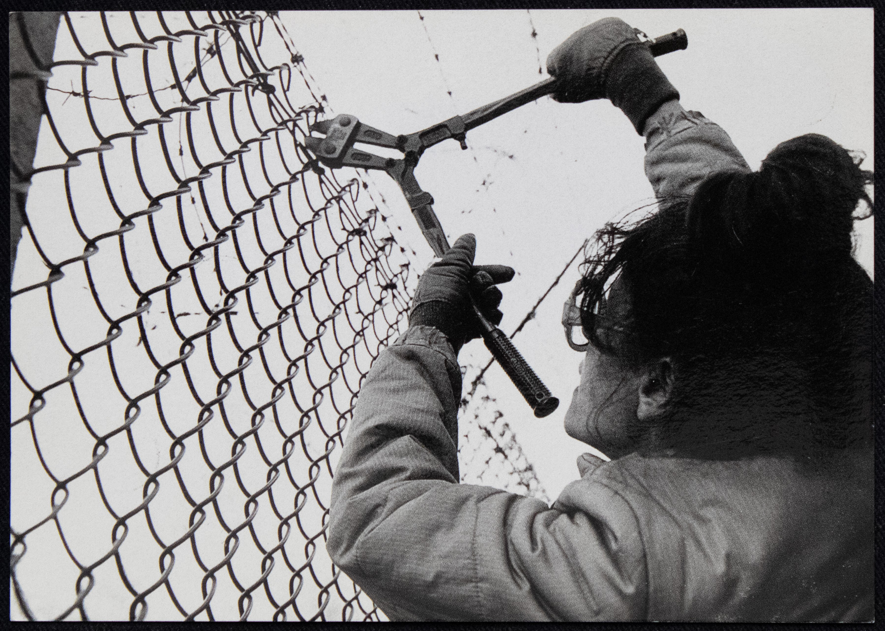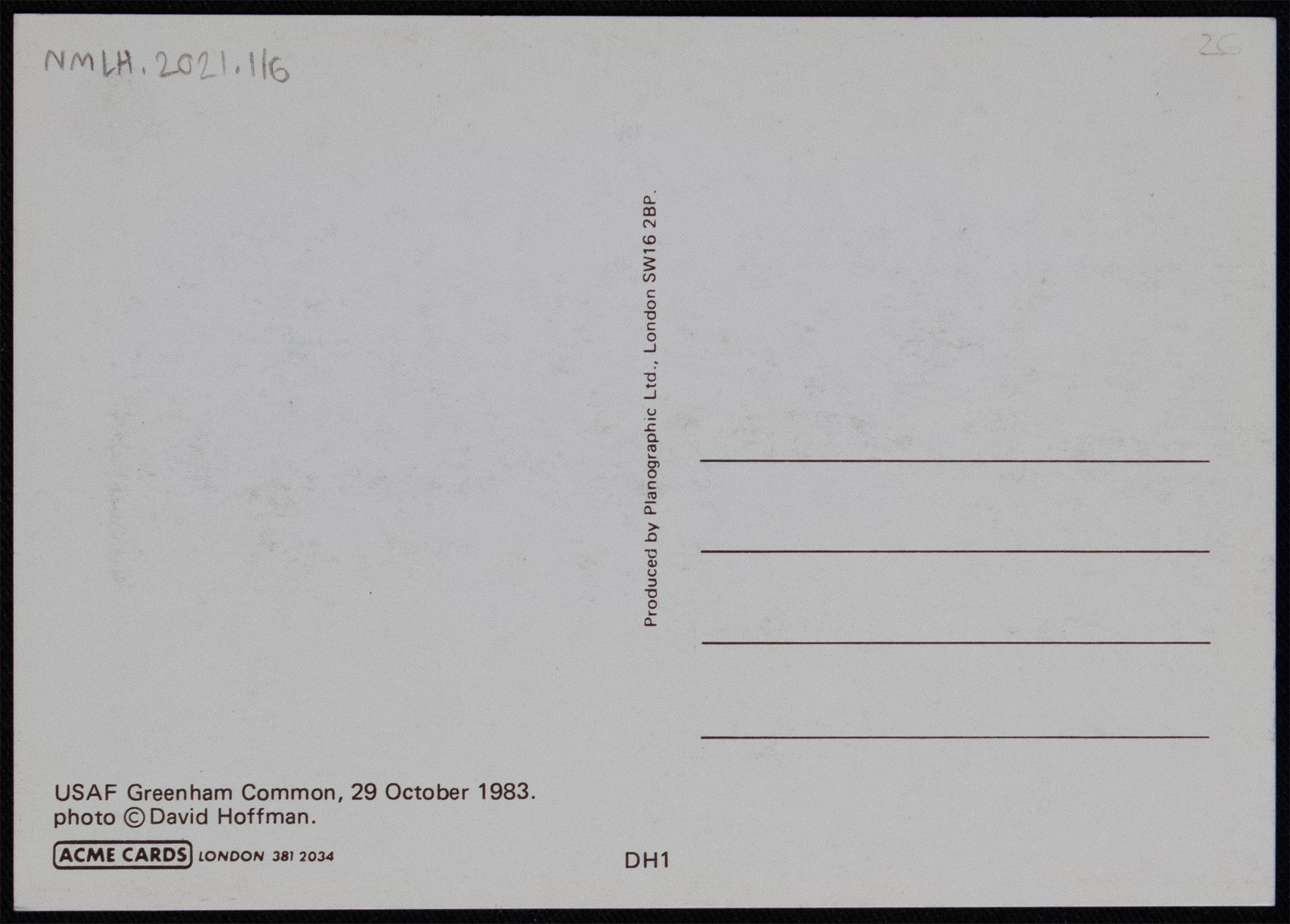 A postcard depicting a protestor from the Greenham Common protest camp in 1983. This postcard shows a black and white photograph of a women using bolt cutters to cut down a fence surrounding the Greenham Common RAF base. The photograph was taken on the 29th October 1983 by David Hoffman, an independent activist and photographer, and was produced by Planographic Limited.