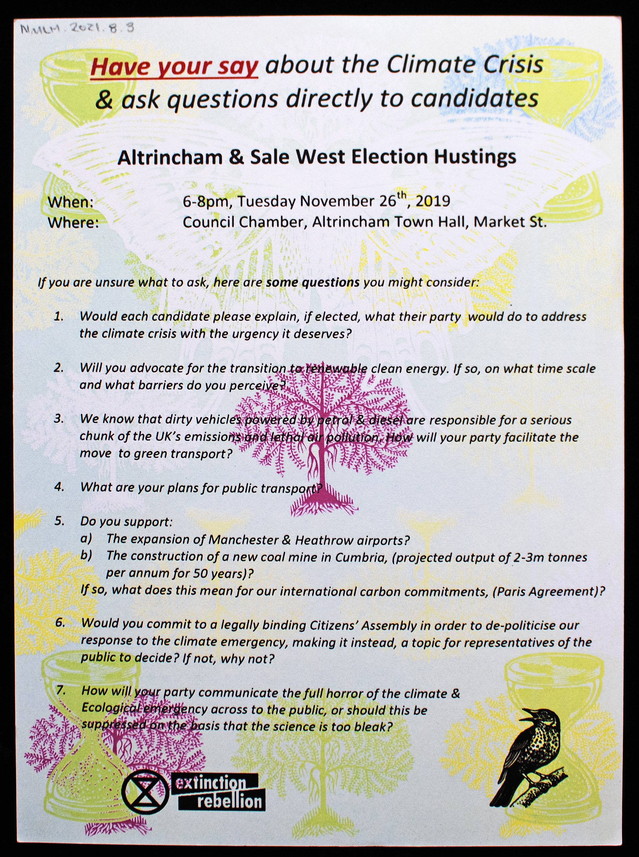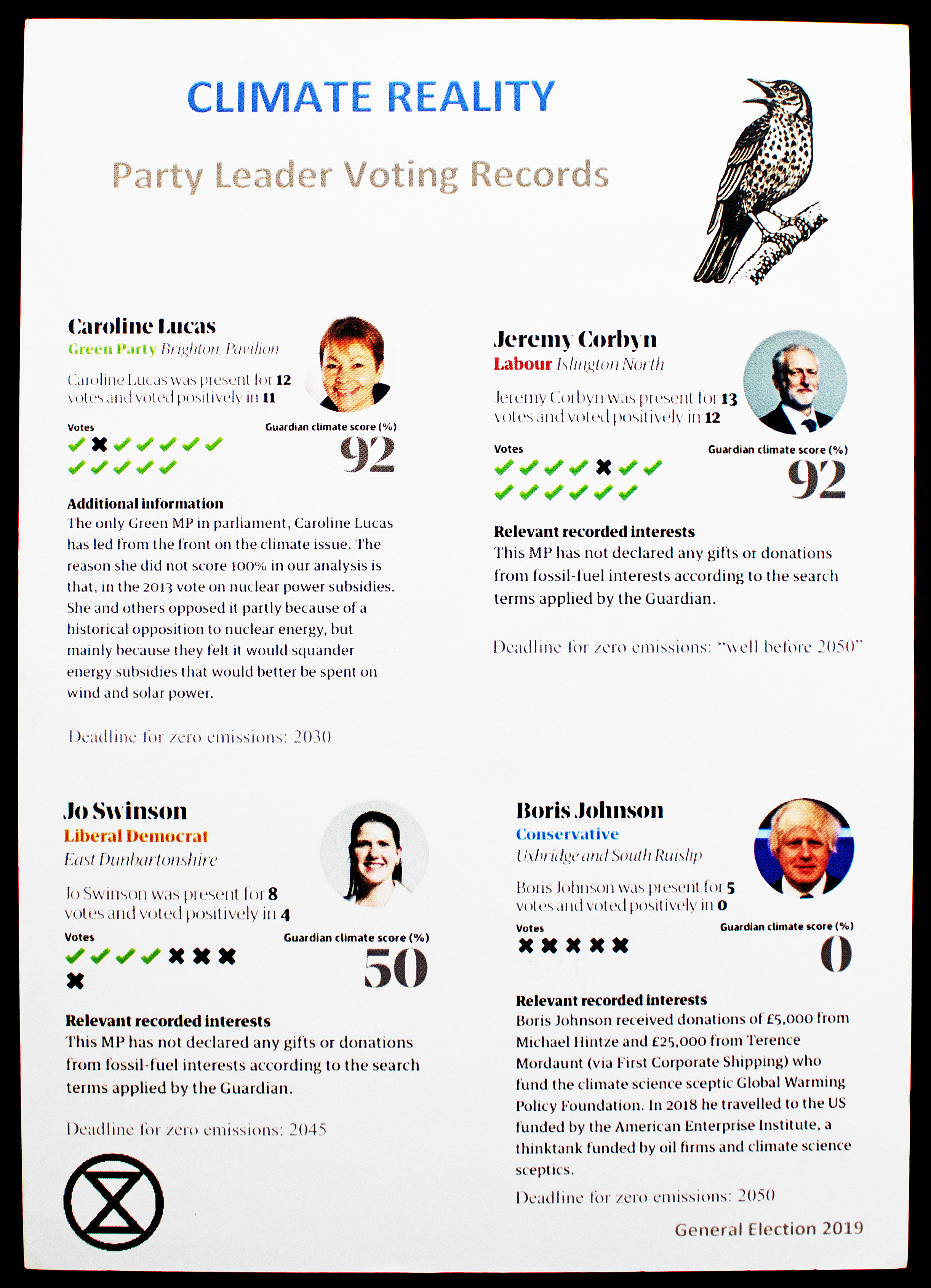 Leaflet, produced by Extinction Rebellion for the 2019 General Election. The leaflet is titled "Climate Emergency" and shows the voting records for the leaders of the Green, Labour, Liberal Democrates, and Conservative political parties. The reverse gives information about the Altrincham & Sale West Election Hustings, held on Tuesday, November 26th 2019.