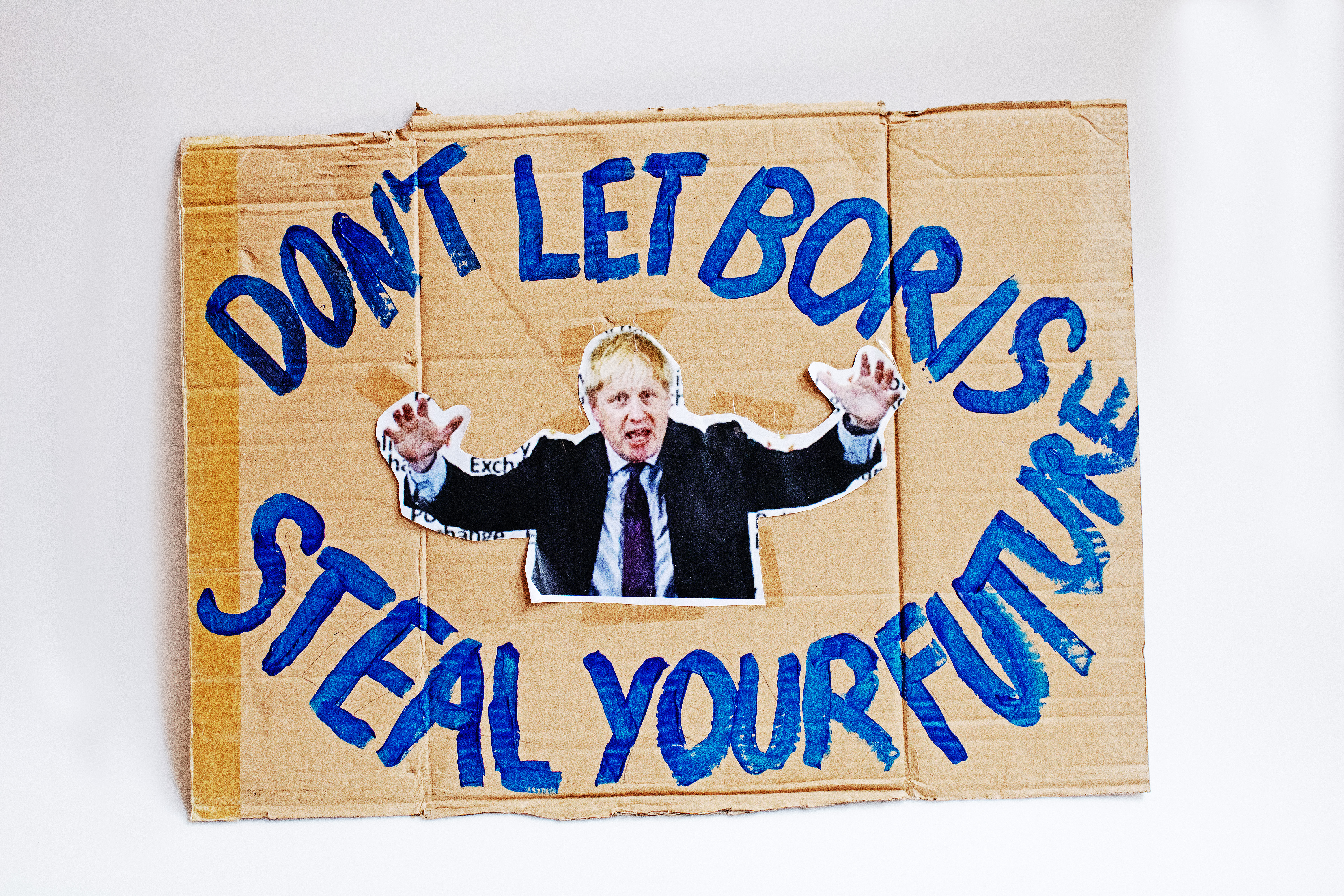 A cardboard placard with a photo of Boris Johnson in the centre surrounded by blue writing which says 'Don't let Boris steal your future'.