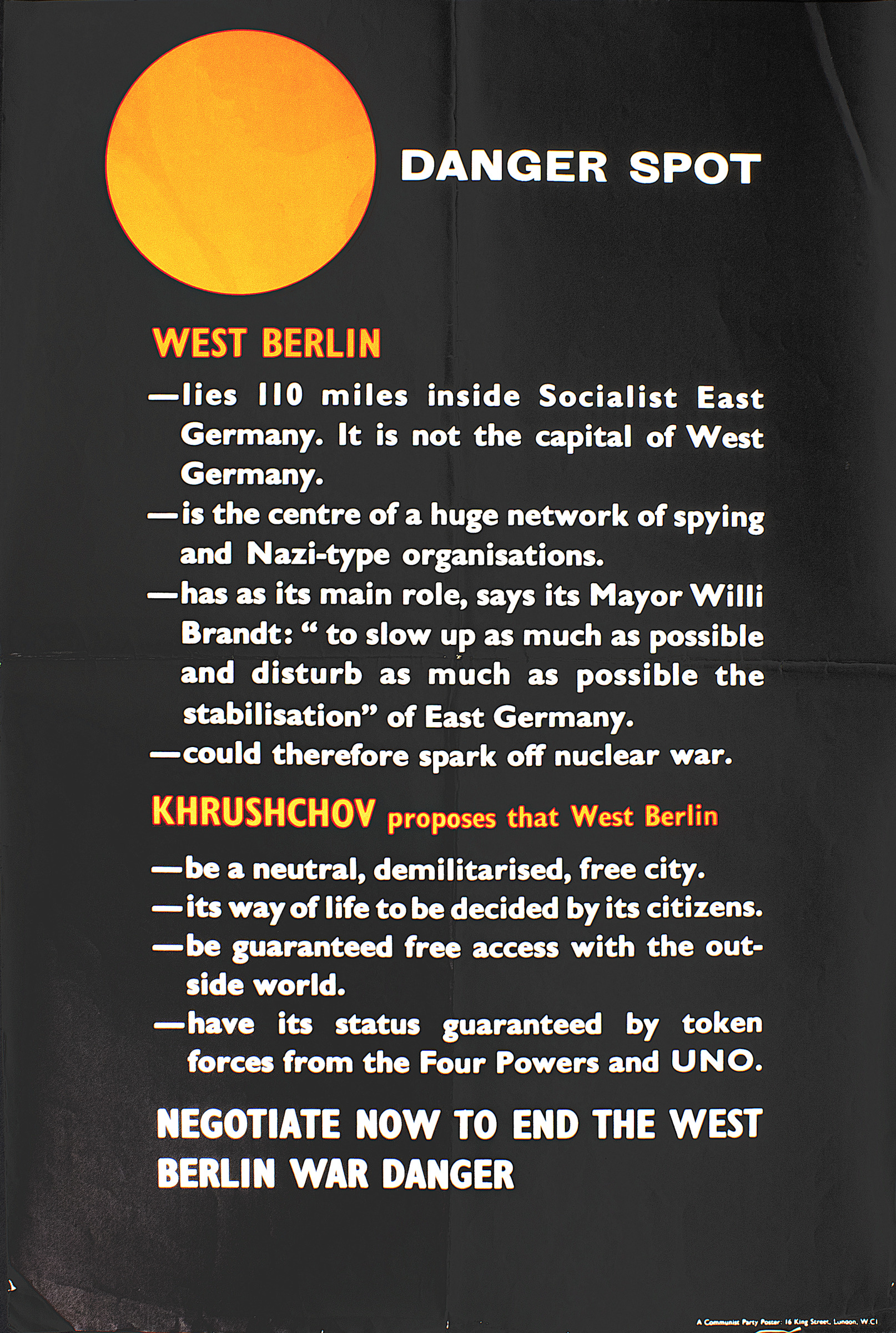 Black poster with red spot and white text, 1961. A large red spot is in the top left hand corner of the poster, next to which the words "Danger spot" are printed in white text. Underneath, the headings "West Berlin" and Khrushchov proposes that West Berlin" are printed in red, with white bullet points underneath. The text is as follows: "West Berlin - lies 110 miles inside the Socialist East Germany. It is not the capital of West Germany. -is the centre of a huge network of spying and Nazi-type organisations. -has as its main role, says its Mayor Willi Brandt: "to slow up as much as possible and disturb as much as possible the stabilisation" of East Germany. -could therefore spark off nuclear war. KHRUSHCHOV proposes that West Berlin -be a neutral, demilitarised, free city. -its way of life to be decided by its citizens. -be guaranteed free access with the outside world. -have its status guaranteed by