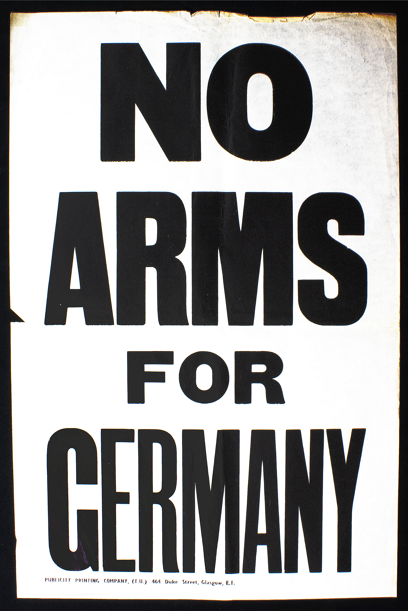 White poster with black text reading "No arms for Germany" in block capitals, around 1955. This poster was made during the Cold War, issued by the Communist Party and printed by Publicity Printing in protest of West Germany joining NATO (North Atlantic Treaty Organisation) and gaining rearmament following WWII. The Communist Party were against German military forces being armed as they thought it carried danger of another war with the Soviet Union over the occupation of East Germany, which could escalate to the use of nuclear weapons. Condition: good, slight tear on the left side