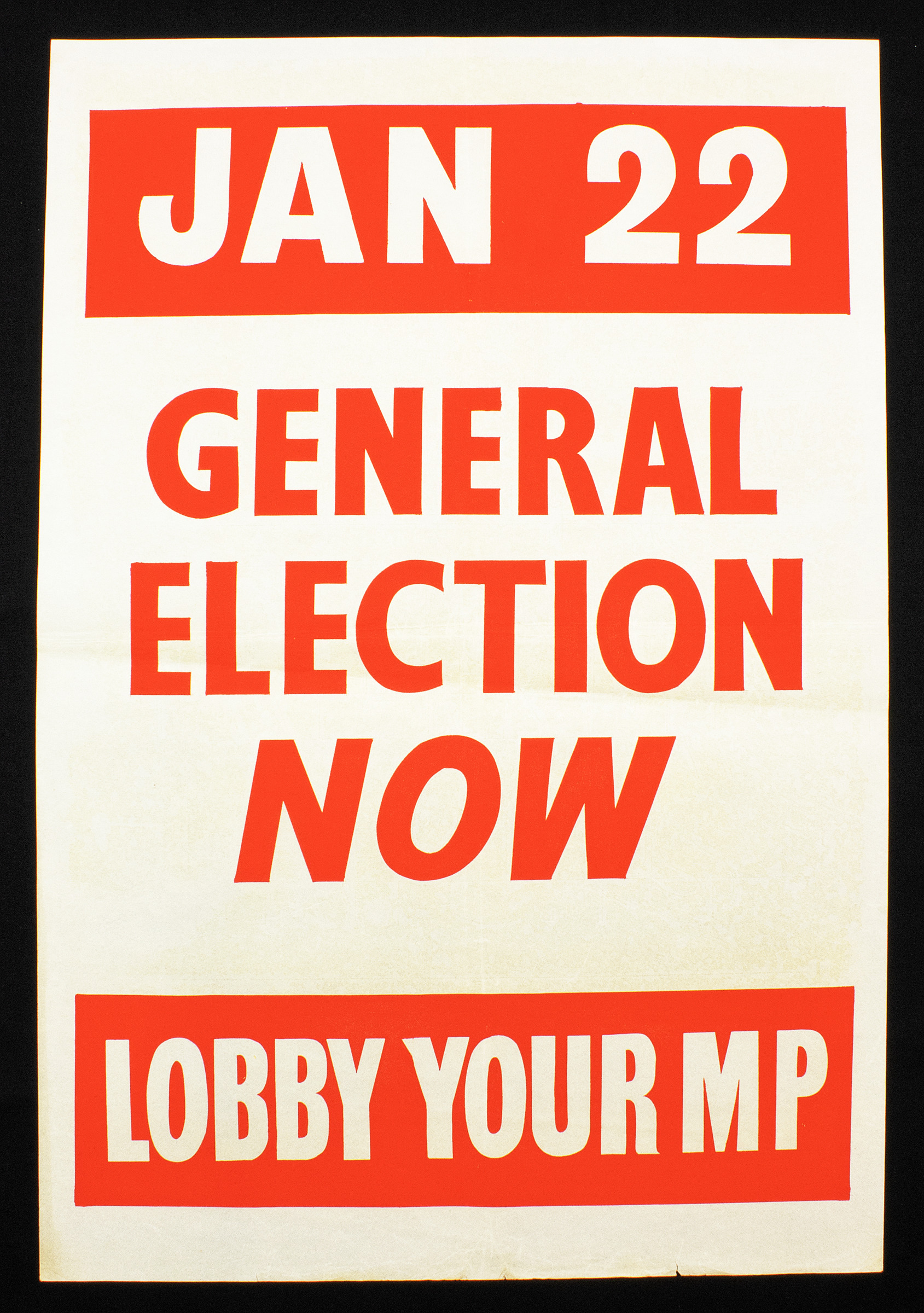 A white poster with red banners. Banner at the top has white text reading "JAN 22" whilst red text in the middle reads "GENERAL ELECTION NOW" and white text in a red banner at the bottom reads "LOBBY YOUR MP", around 1957. This poster was part of a campaign by the Communist Party to call for a general election following Anthony Eden's resignation and appointment of Harold Macmillan as Prime Minister of the UK. The Communist party campaigned for not just a change of Prime Minister but a change of government, including another general election to try and get rid of a Conservative majority following the Suez crisis, the testing and development of nuclear weapons, and resulting economic hardship. Condition: good, slight tears along the bottom edge.