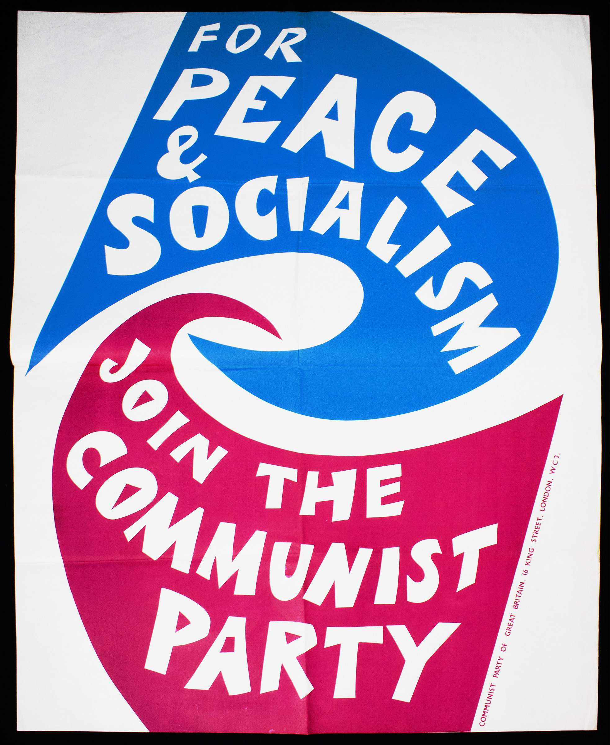 A large white poster with blue and pink interconnecting swirls, made to encourage recruitment to the Communist Party of Great Britiajn, 1961. Writing inside the swirls reads "For peace and socialism / Join the Communist Party" Writing on the back says "Recruiting poster - June 1961) Condition: good, creases where it has previously been folded