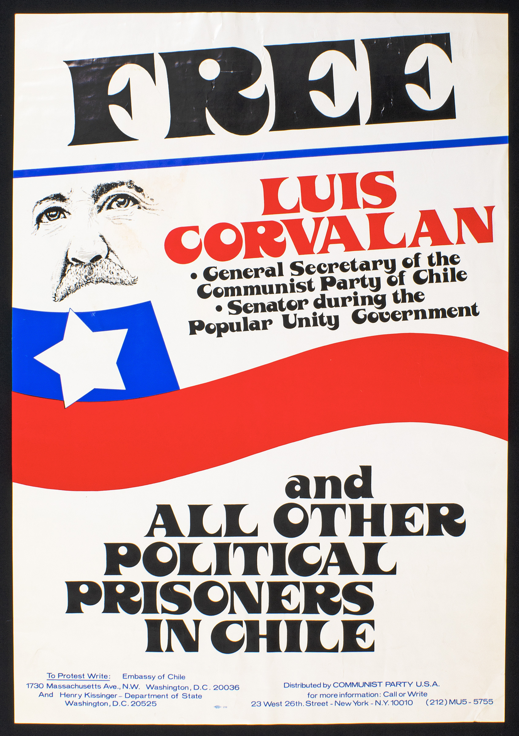 was exchanged for a Soviet political prisoner, Vladimir Bukovsky. Corvalan received asylum in the USSR - he headed the Communist party of Chile - in Chile and while in exile , for 30 years, which covered the entirety of Pincohet's dictatorship. This poster was distributed by the American Communist party, and was calling for the freedom of Corvalan and other political prisoners in Chile, who were all imprisoned under Pinochet's dictatorship. The bottom of the poster has blue text saying "to protest write: Embassy of Chile, 1730 Massachusetts Ave., N.W. Washington D.C. 20036 and Henry Kissinger - Department of State, Washington D.C 20525." "Distributed by Communist Party U.SA.for more information callorright 23 West 26th Street-New York -N.Y.10010 (212) MU5-5755."
