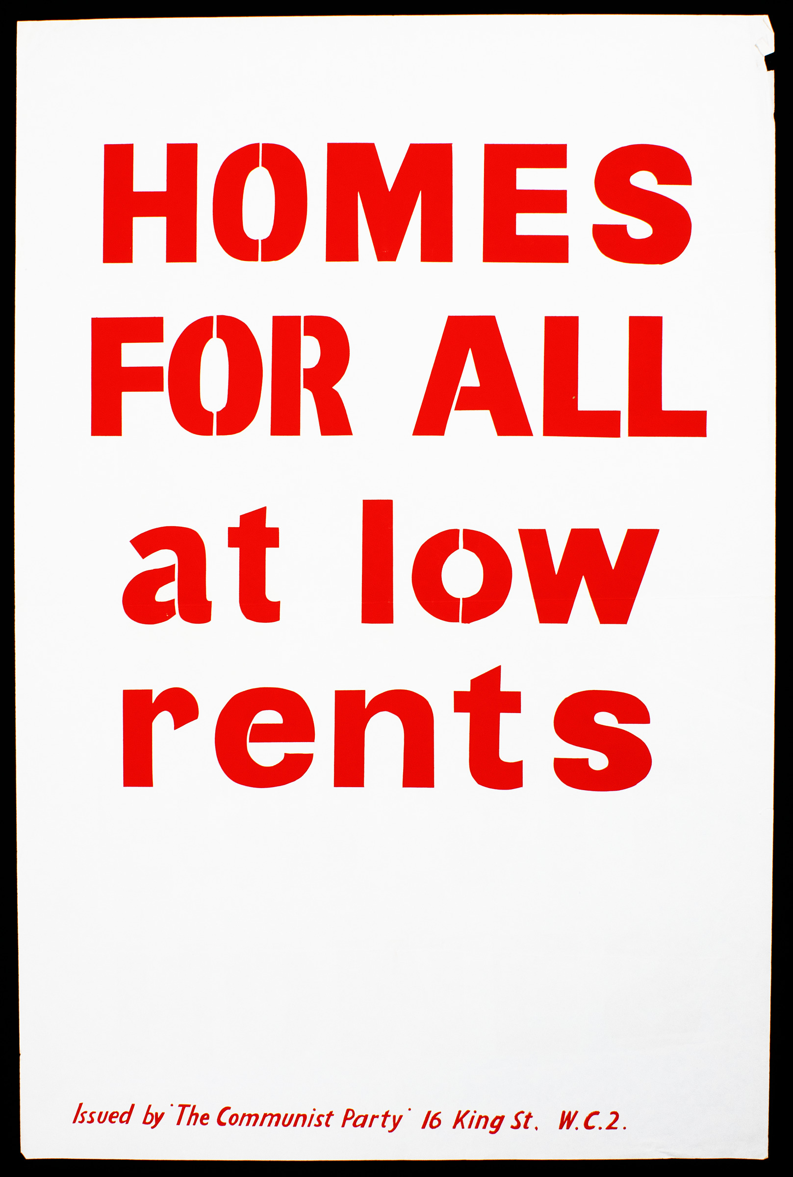 A white poster featuring red text reading "HOMES FOR ALL AT LOW RENTS". This poster was part of the Communist Party's 1950 election campaign, where members such as Harry Pollitt, Rajani Palme Dutt, and Willie Gallacher stood for election. Small red print at the bottom reads "Issued by The Communist Party 16 King Street W.C.2 " Condition: good