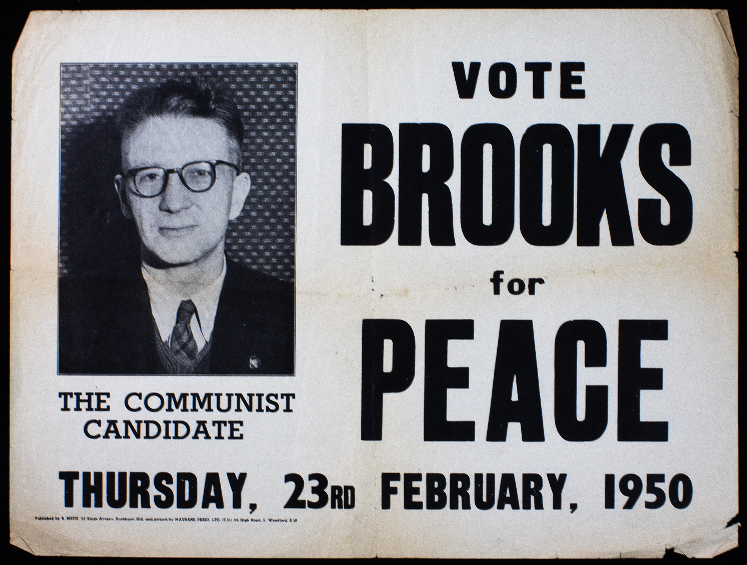 A white poster featuring a photograph of William Brooks, a Communist Party member who stood for election in Woodford during the 1950 general election. Black text reads: "Vote BROOKS for PEACE / The Communist Candidate / Thursday 23rd February, 1950". The poster was published by R Meth and printed by Maybank Press. There is tearing at the edges of the poster and it has yellowed around the sides.