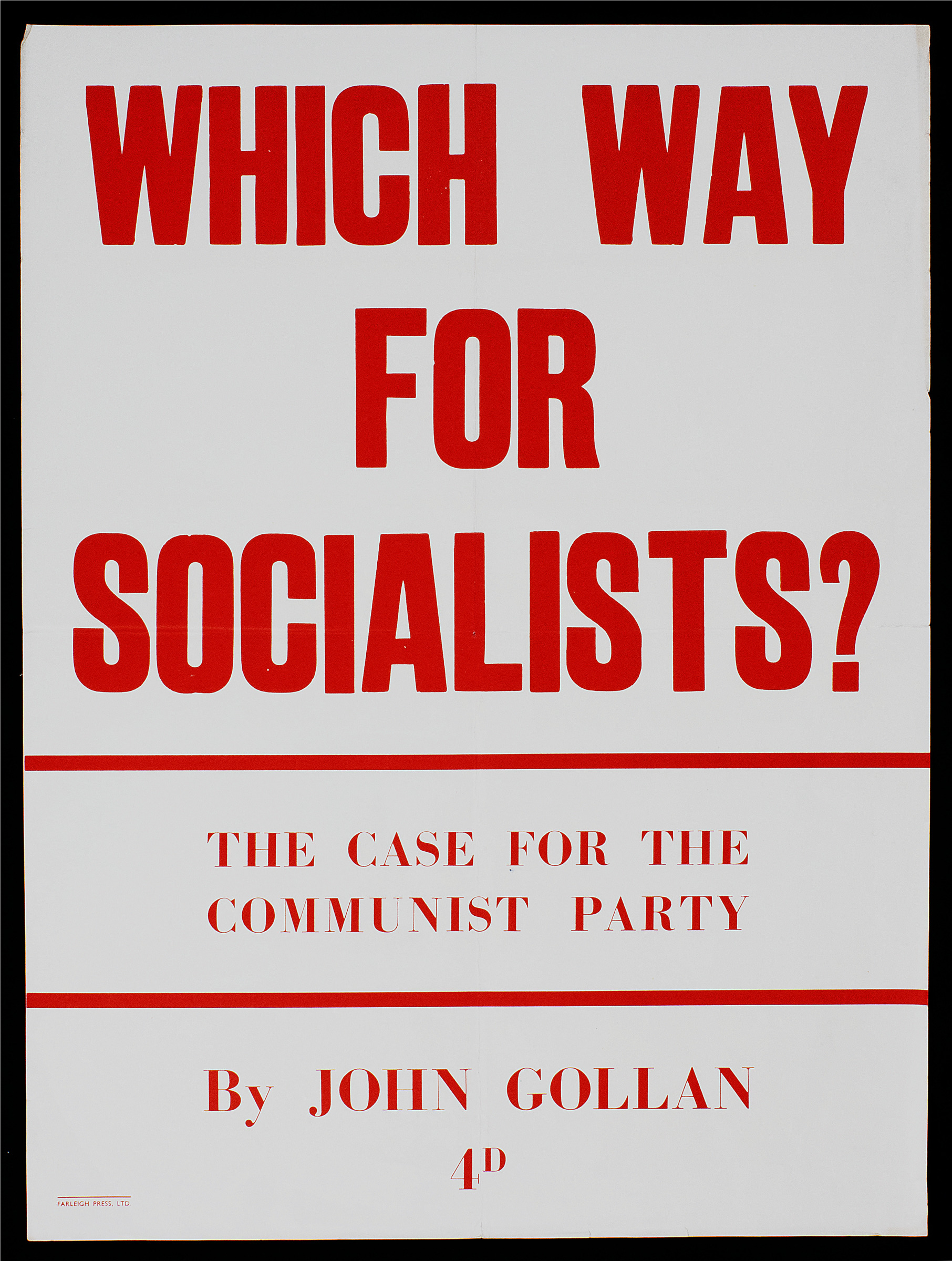 A small white poster with red letters reading "WHICH WAY FOR SOCIALISTS? / THE CASE FOR THE COMMUNIST PARTY / By John Gollan / 4p", 1958. John Gollan was a lifelong socialist, trade union activist, and member of the Communist Party of Great Britain. He first got involved in politics during the general strike of 1926, after which he joined the Young Communist League (YCL) and went on to be elected general secretary of the Communist Party in 1954. Gollan wrote for the Daily Worker, the Communist Party's official newspaper, and released a number of publications with the Communist Party advocating for socialism in Britain. This pamphlet, 'Why way for socialists?' was published in 1958 by Farleigh Press.