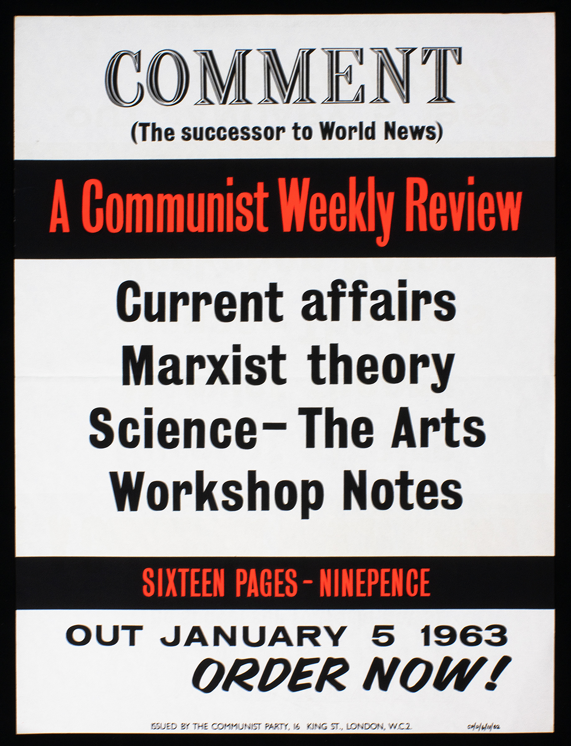 This is a white poster with black banners and black and red text advertising Comment newspaper, a weekly Communist Party publication detailing world news, 1962. The poster reads "COMMENT (The successor to World News) / A Communist Weekly Review / Current affairs Marxist theory Science - The Arts Workshop Notes / Sixteen pages - nine pence / Out January 5 1963 / ORDER NOW!" 'Writing on the back reads "November 1962"