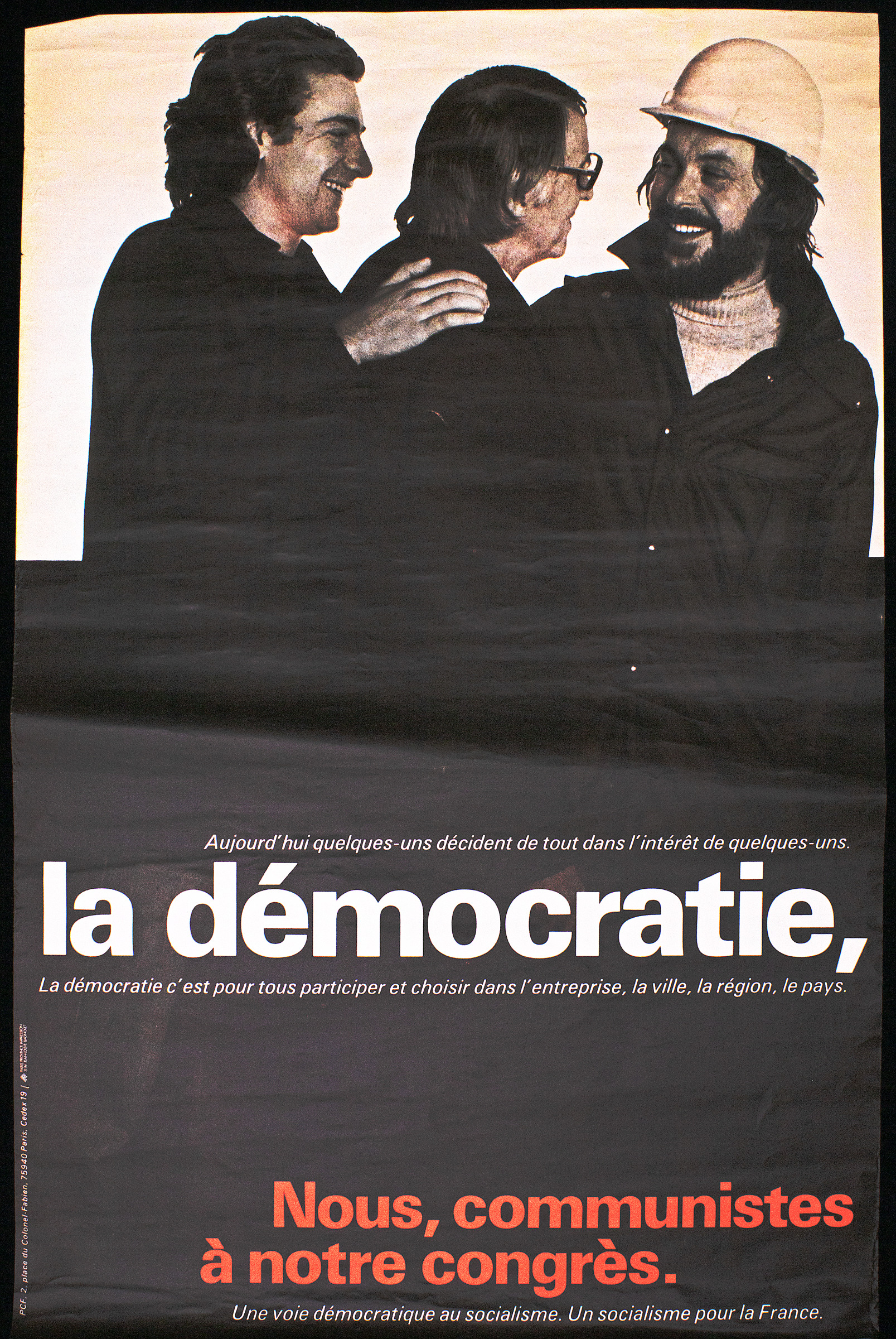 A large poster with a black and white background of three men smiling at each other; one is wearing a hard hat and another a suit. White text in the centre of the poster reads "Today a few decide everything in the interests of a few. Democracy is for everyone to participate and choose in the company, the city, the region, the country" (translated from French). The bottom of the poster reads "We communists at our congress, a democratic path to socialism. Socialism for France." This poster was printed by the Paris Province Impression and produced by the French Communist Party to promote their 22nd congress which took place in February 1976.