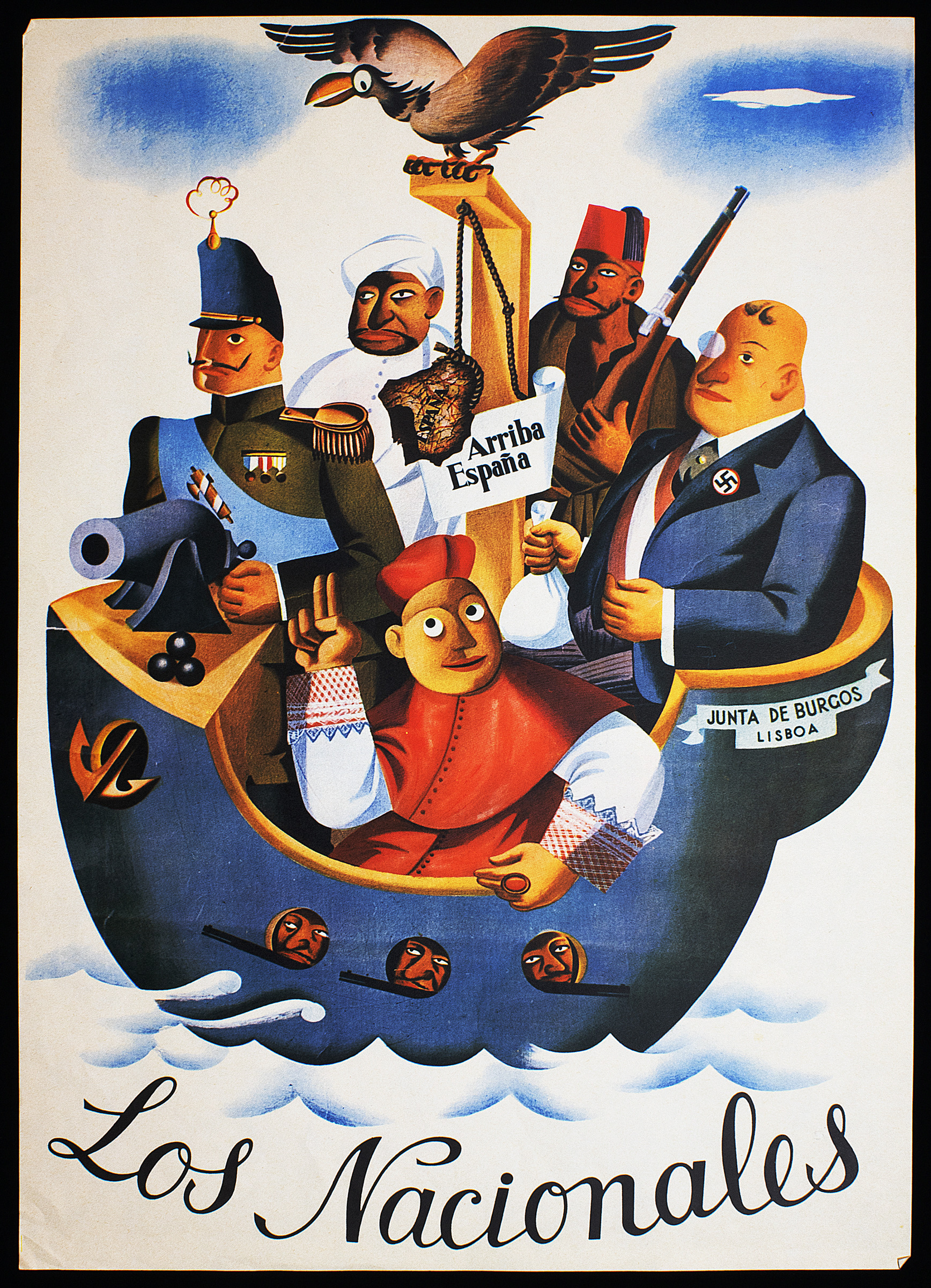 Large print, part of the portfolio of Civil War posters in Spain. This poster is titled "Los Nacionales" - the nationalists. The poster is of a large cartoon - there is a boat with five men standing inside. Each represents an ally of the nationalists. There is a bird sitting at the top, and there is a sign which says "Arriba Espana" which translates to "go Spain" - there is a broken map drawing of Spain next to this sign. The different figures in the boat are caricatures of figures/groups that were held responsible for the Nationalist party taking power. Each represents an ally of the Nationalists - an Italian in uniform with the fasces insignia on his chest; and a German diplomat with a swastika badge and a monocle. To the right of the Italian military are two North African soldiers; together with the three soldiers that peer out from the portholes in the lower section of the image, they represent the Moroccan troops that participated in the war. In using these figures, the designer