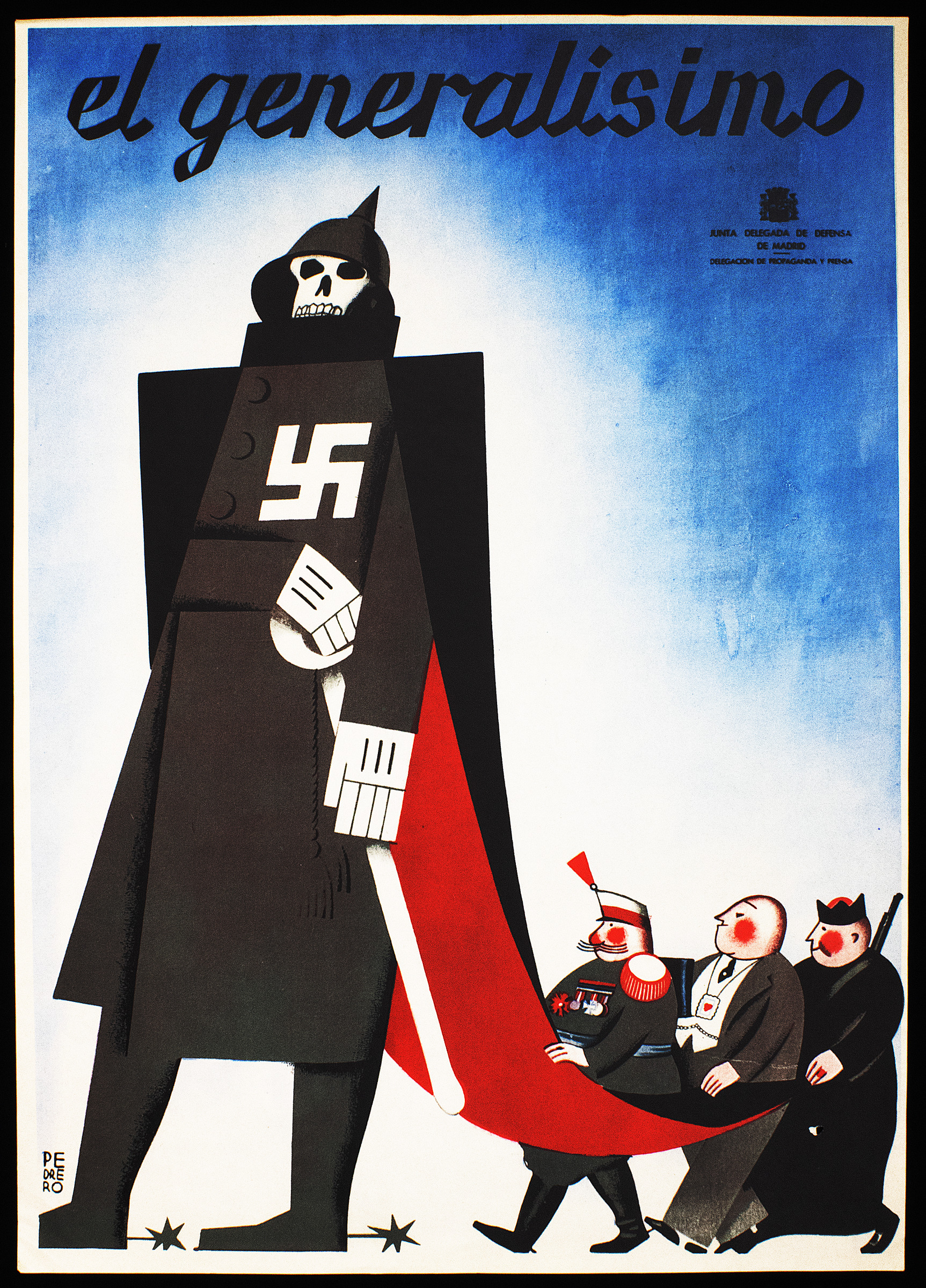 Large poster, titled "El Generalisimo." This refers to General Francisco Franco. The poster shows a very large figure, with a skeleton like face and a cubist-style uniform inscribed with a Nazi Swastika on the front. This is supposed to be Franco. He has a long red cape, which is being held by three much smaller military men - this empha2 sises Franco's power and dictatorship. The artists signature is in black text on the side - "Pedrero."He was a member of the Fine Arts Section of the socialist trade-union (Sindicato de Profesionales de las Bellas Artes, UGT), which was one of the most important organizations of artists active in the propaganda effort during the war. He is know to have designed other propaganda posters for the Junta Delegada de Defensa de Madrid, the agency that issued this poster. This portfolio collection considers the Spanish Civil War, which was from 1936-1939. In July 1936,General Franco launched a coup de ta against the left wing, democratically elected