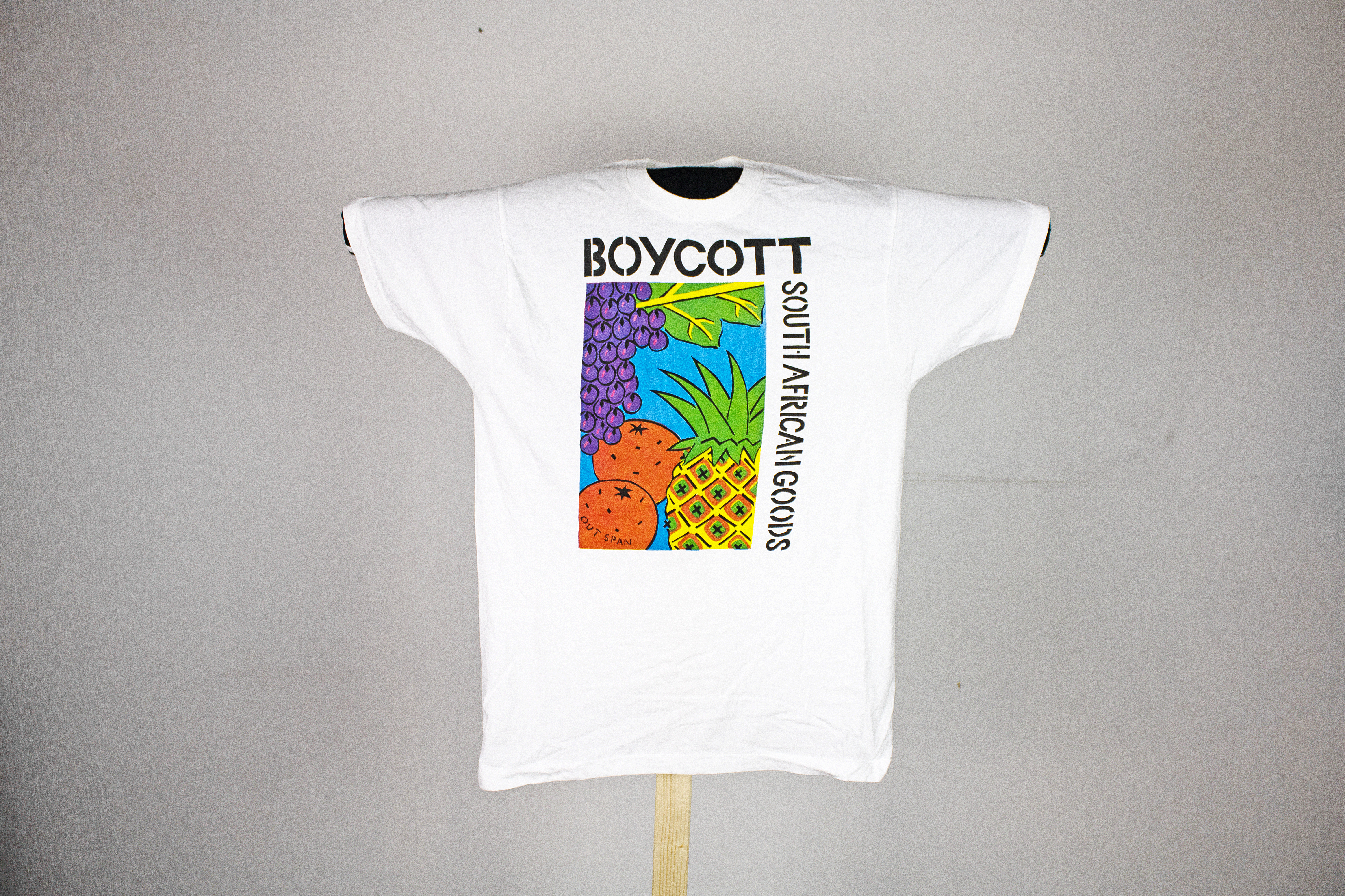 A white t-shirt featuring an illustration of a pineapple, oranges, and grapes. Black text along the top and down the right side of the image reads "BOYCOTT SOUTH AFRICAN GOODS". This t-shirt was produced in the 1980's to protest against apartheid in South Africa. It urges people to stop buying South African fruit and vegetables in order to stop supporting the South African government's apartheid policies.