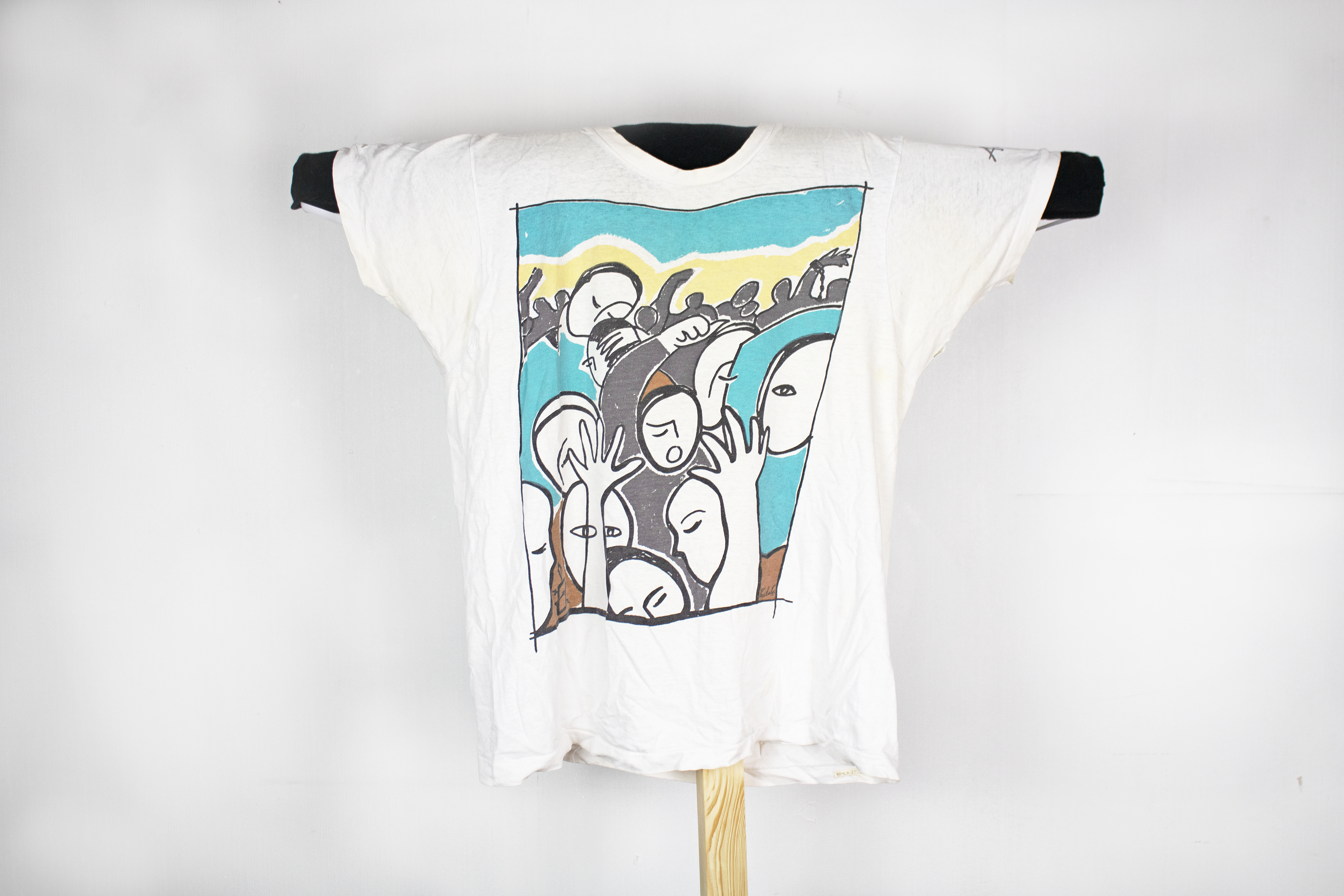 A white t-shirt featuring an illustration of a crowd with their arms in the air, printed in yellow, black, and blue. The Amnesty International logo is in the bottom left corner of the image. This t-shirt was likely produced for one of the human rights concerts Amnesty International held throughout the 1980's to raise funds for their work.