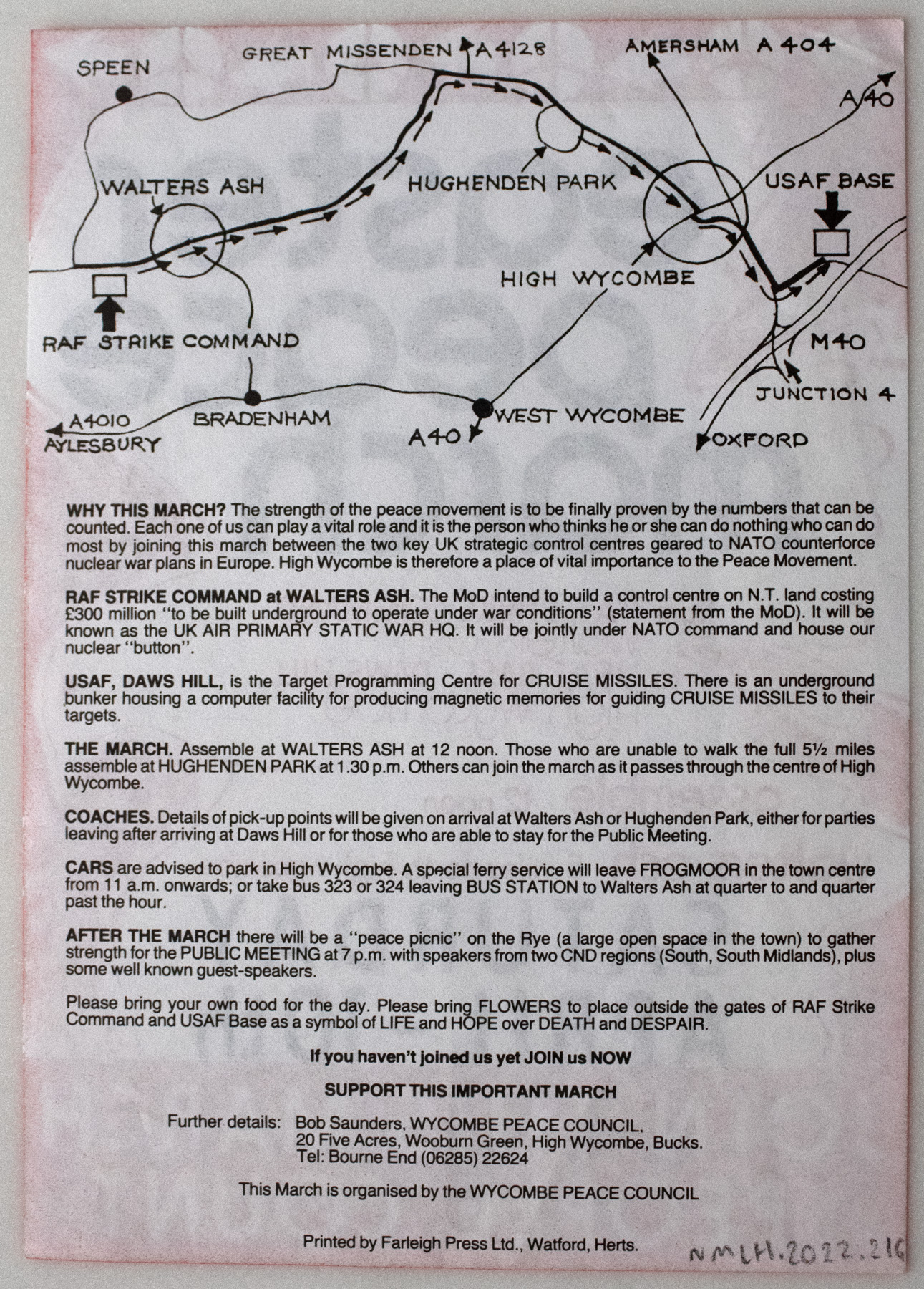 The back of the leaflet features a hand drawn map of the High Wycombe area, including the route of the advertised march. Underneath is information about the USAF base stationed there and why it is important to protest it. This was an army base that developed technology for the effective detonation of Cruise Missiles during the Cold War and peace activists protested it regularly. This particular march was organised by the Wycombe Peace Council.