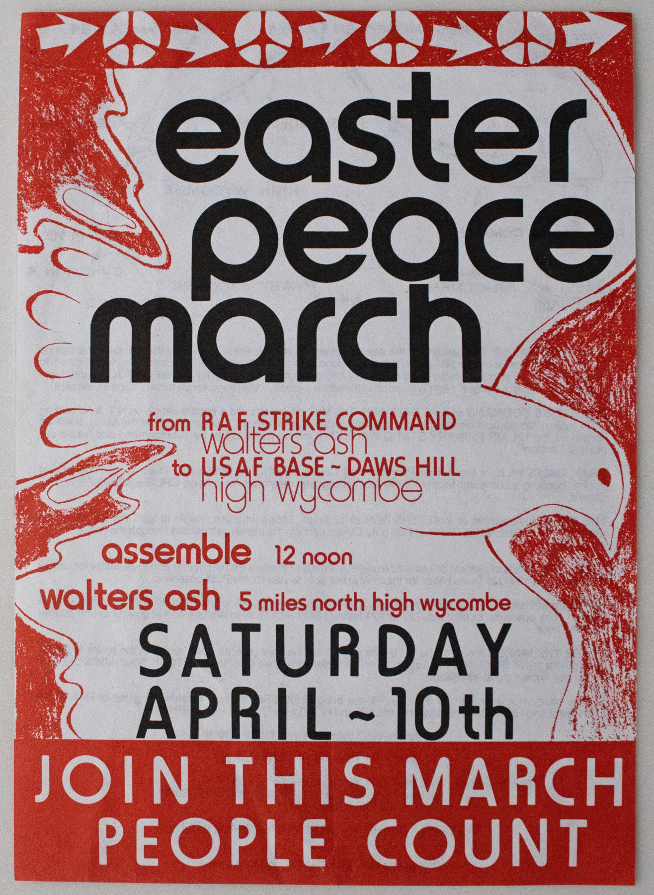 A red poster featuring a large illustration of a white dove. Black and red text reads: "easter peace march / from RAF STRIKE COMMAND / Walter ash / to US AF BASE DAWS HILL / high wycombe / assemble 12 noon / walters ash 5 miles north high wycombe / SATURDAY APRIL 10th / JOIN THIS MARCH / PEOPLE COUNT"